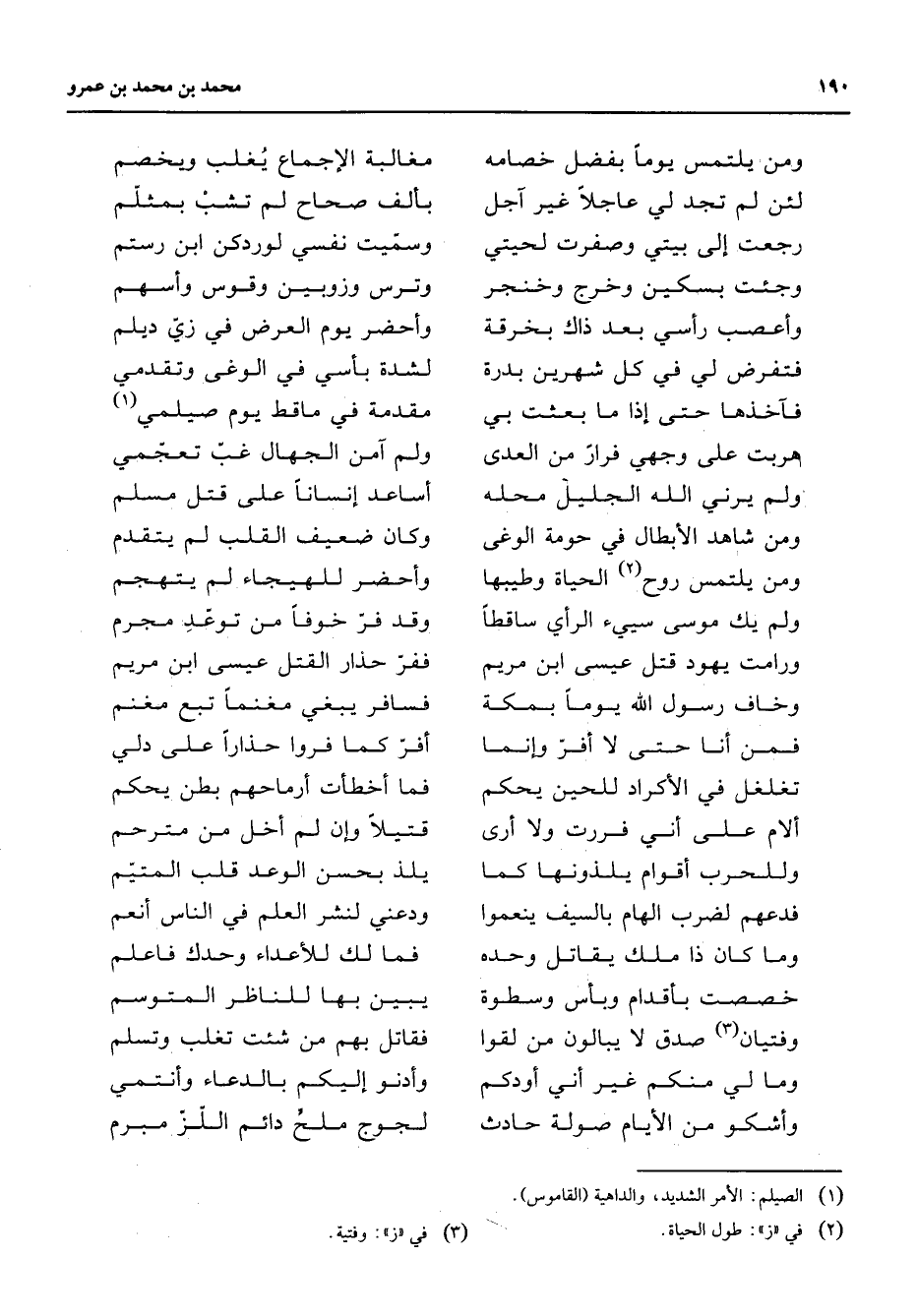 ومن يلتمس يوما بفضل خصامه * مغالبة الإجماع يغلب ويخصم لئن لم تجد لي عاجلا غير آجل * بألف صحاح لم تشب بمثلم رجعت إلى بيتي وصفرت لحيتي * وسميت نفسي لوردكن ابن رستم وجئت بسكين وخرج وخنجر * وترس وزوبين وقوس وأسهم وأعصب رأسي بعد ذاك بخرقة * وأحضر يوم العرض في زي ديلم فتفرض لي في كل شهرين بدرة * لشدة بأسي في الوغى وتقدمي فاخذها حتى إذا ما بعثت بي * مقدمة في ماقط يوم صيلمي (1) هربت على وجهي فرار من العدى * ولم آمن الجهال غب تعجمي ولم يرني الله الجليل محله * أساعد إنسانا على قتل مسلم ومن شاهد الأبطال في حومة الوغى * وكان ضعيف القلب لم يتقدم ومن يلتمس روح (2) الحياة وطيبها * وأحضر للهيجاء لم يتهجم ولم يك موسى سيئ الرأي ساقطا * وقد فر خوفا من توعد مجرم ورامت يهود قتل عيسى ابن مريم * ففر حذار القتل عيسى ابن مريم وخاف رسول الله يوما بمكة * فسافر يبغي مغنما تبع مغنم فمن أنا حتى لا أفر وإنما * أفر كما فروا حذارا على دلي تغلغل في الأكراد للحين يحكم * فما أخطأت أرماحهم بطن يحكم ألام على أني فررت ولا أرى * قتيلا وإن لم أخل من مترحم وللحرب أقوام يلذونها كما * يلذ بحسن الوعد قلب المتيم فدعهم لضرب الهام بالسيف ينعموا * ودعني لنشر العلم في الناس أنعم وما كان ذا ملك يقاتل وحده * فما لك للأعداء وحدك فاعلم خصصت بأقدام وبأس وسطوة * يبين بها للناظر المتوسم وفتيان (3) صدق لا يبالون من لقوا * فقاتل بهم من شئت تغلب وتسلم وما لي منكم غير أني أودكم * وأدنو إليكم بالدعاء وأنتمي وأشكو من الأيام صولة حادث * لجوج ملح دائم اللز مبرم