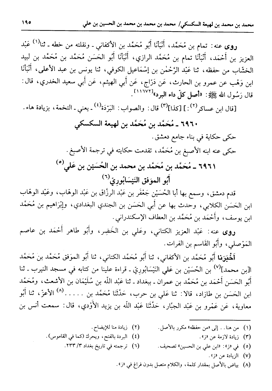 6961 - محمد بن محمد بن محمد بن الحسين بن علي (5) أبو الموفق النيسابوري (6) قدم دمشق وسمع بها أبا الحسين جعفر بن عبد الرزاق بن عبد الوهاب وعبد الوهاب ابن الحسن الكلابي وحدث بها عن أبي الحسن بن الجندي البغدادي وإبراهيم بن محمد ابن يوسف وأحمد بن محمد بن العطاف الإسكندراني روى عنه عبد العزيز الكتاني وعلي بن الخضر وأبو طاهر أحمد بن عاصم الموصلي وأبو القاسم بن الفرات أخبرنا أبو محمد بن الأكفاني ثنا أبو محمد الكتاني ثنا أبو الموفق محمد بن محمد ابن محمد (7) بن الحسين بن علي النيسابوري قراءة علينا من كتابه في مسجد النيرب ثنا أبو الحسن أحمد بن محمد بن عمران ببغداد ثنا عبد الله بن سليمان بن الأشعث ومحمد ابن الحسين بن طازاد قالا ثنا علي بن حرب حدثنا محمد بن