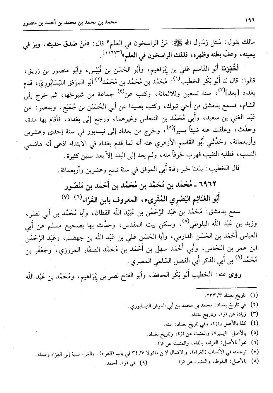 [11673] أخبرنا أبو القاسم علي بن إبراهيم وأبو الحسن بن قبيس وأبو منصور بن زريق قالوا قال لنا أبو بكر الخطيب (1) محمد بن محمد بن محمد (2) أبو الموفق النيسابوري قدم بغداد بعد (3) سنة تسعين وثلاثمائة وكتب عن (4) جماعة من شيوخها ثم خرج إلى الشام فسمع بدمشق من أخي تبوك وكتب بصيدا عن أبي الحسين بن جميع وبمصر عن عبد الغني بن سعيد وأبي محمد بن النحاس وغيرهما ورجع إلى بغداد فأقام بها مدة وحدث وعلقت عنه شيئا يسيرا (5) وخرج من بغداد إلى نيسابور في سنة إحدى وعشرين وأربعمائة وحدثني أبو القاسم الأزهري عنه أنه لما قدم بغداد في الابتداء ادعى أنه هاشمي النسب فطلبه النقيب فهرب خوفا منه ولم يعد إلى البلد إلا بعد سنين كثيرة 6962 - محمد بن محمد بن محمد بن أحمد بن منصور أبو الغنائم البصري المقرئ المعروف بابن الغراء (6) (7) سمع بدمشق محمد بن عبد الرحمن بن عبيد الله القطان وأبا محمد بن أبي نصر وزيد بن عبد الله البلوطي (8) وسكن بيت المقدس وحدث بها بصحيح مسلم عن أبي العباس أحمد بن الحسن الدارمي وأبا الحسن علي بن عبد الله بن جهضم وعبد الرحمن ابن عمر بن النحاس وأبي أحمد سهل بن أحمد بن محمد الصفار المروزي وجعفر بن محمد (9) بن أبي الذكر أبي الفضل السلمي المصري روى عنه الخطيب أبو بكر الحافظ وأبو الفتح نصر بن إبراهيم ومحمد بن عبد الله