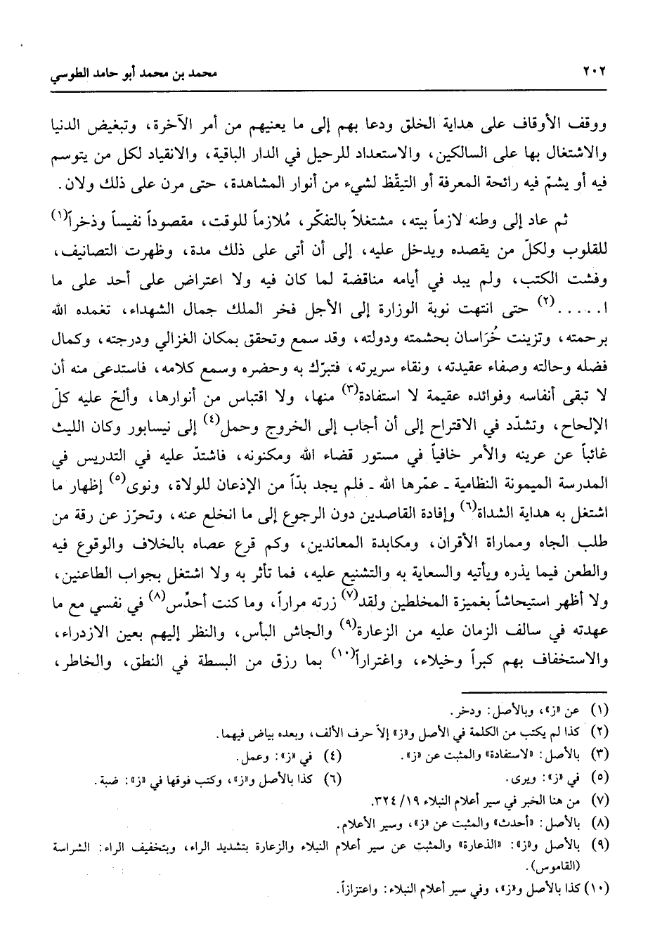 (2) حتى انتهت نوبة الوزارة إلى الأجل فخر الملك جمال الشهداء تغمده الله برحمته وتزينت خراسان بحشمته ودولته وقد سمع وتحقق بمكان الغزالي ودرجته وكمال فضله وحالته وصفاء عقيدته ونقاء سريرته فتبرك به وحضره وسمع كلامه فاستدعى منه أن لا تبقى أنفاسه وفوائده عقيمة لا استفادة (3) منها ولا اقتباس من أنوارها وألح عليه كل الإلحاح وتشدد في الاقتراح إلى أن أجاب إلى الخروج وحمل (4) إلى نيسابور وكان الليث غائبا عن عرينه والأمر خافيا في مستور قضاء الله ومكنونه فاشتد عليه في التدريس في المدرسة الميمونة النظامية عمرها الله فلم يجد بدا من الإذعان للولاة ونوى (5) إظهار ما اشتغل به هداية الشداة (6) وإفادة القاصدين دون الرجوع إلى ما انخلع عنه وتحرز عن رقة من طلب الجاه ومماراة الأقران ومكابدة المعاندين وكم قرع عصاه بالخلاف والوقوع فيه والطعن فيما يذره ويأتيه والسعاية به والتشنيع عليه فما تأثر به ولا اشتغل بجواب الطاعنين ولا أظهر استيحاشا بغميزة المخلطين ولقد (7) زرته مرارا وما كنت أحدس (8) في نفسي مع ما عهدته في سالف الزمان عليه من الزعارة (9) والجأش البأس والنظر إليهم بعين الازدراء والاستخفاف بهم كبرا وخيلاء واغترارا (10) بما رزق من البسطة في النطق والخاطر