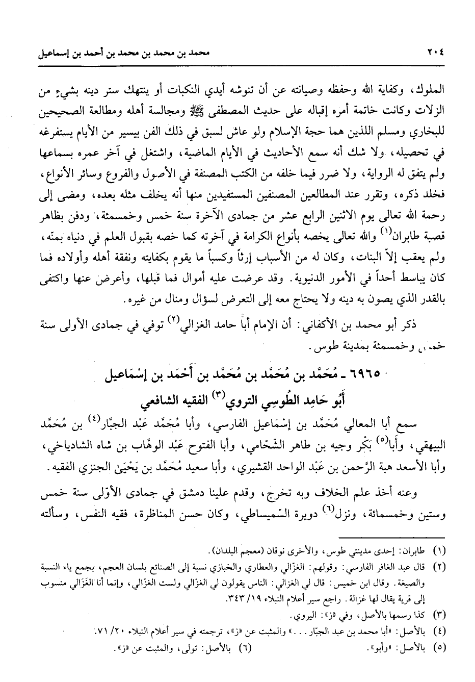الملوك وكفاية الله وحفظه وصيانته عن أن تنوشه أيدي النكبات أو ينتهك ستر دينه بشئ من الزلات وكانت خاتمة أمره إقباله على حديث المصطفى (صلى الله عليه وسلم) ومجالسة أهله ومطالعة الصحيحين للبخاري ومسلم اللذين هما حجة الإسلام ولو عاش لسبق في ذلك الفن بيسير من الأيام يستفرغه في تحصيله ولا شك أنه سمع الأحاديث في الأيام الماضية واشتغل في آخر عمره بسماعها ولم يتفق له الرواية ولا ضرر فيما خلفه من الكتب المصنفة في الأصول والفروع وسائر الأنواع فخلد ذكره وتقرر عند المطالعين المصنفين المستفيدين منها أنه يخلف مثله بعده ومضى إلى رحمة الله تعالى يوم الإثنين الرابع عشر من جمادى الآخرة سنة خمس وخمسمائة ودفن بظاهر قصبة طابران (1) والله تعالى يخصه بأنواع الكرامة في آخرته كما خصه بقبول العلم في دنياه بمنه ولم يعقب إلا البنات وكان له من الأسباب إرثا وكسبا ما يقوم بكفايته ونفقة أهله وأولاده فما كان يباسط أحدا في الأمور الدنيوية وقد عرضت عليه أموال فما قبلها وأعرض عنها واكتفى بالقدر الذي يصون به دينه ولا يحتاج معه إلى التعرض لسؤال ومنال من غيره ذكر أبو محمد بن الأكفاني أن الإمام أبا حامد الغزالي (2) توفي في جمادى الأولى سنة خمس وخمسمائة بمدينة طوس