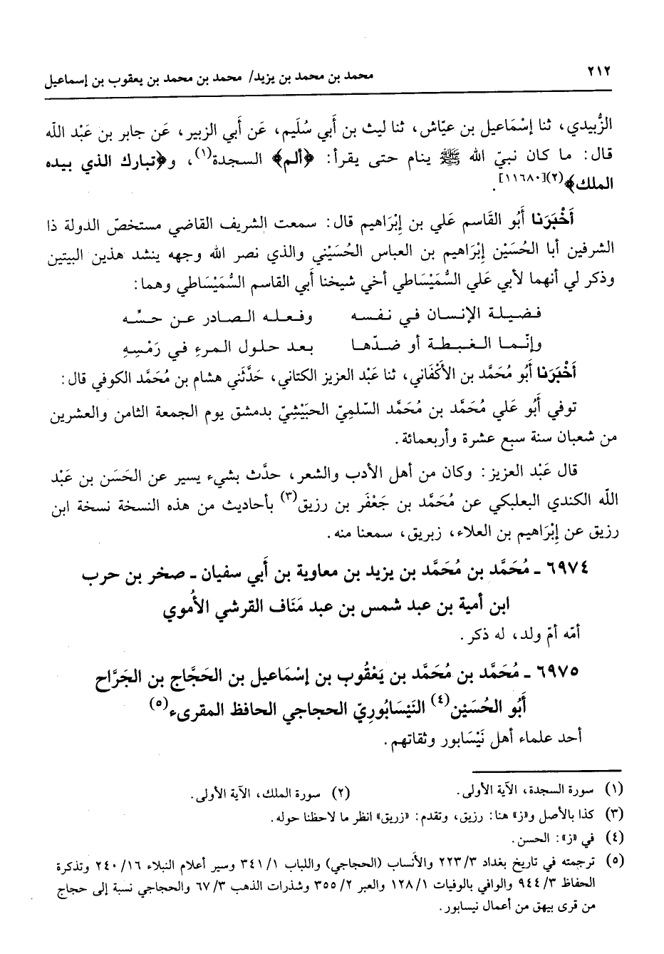 (5) ترجمته في تاريخ بغداد 3 / 223 والانساب (الحجاجي) واللباب 1 / 341 وسير أعلام النبلاء 16 / 240 وتذكرة الحفاظ 3 / 944 والوافي بالوفيات 1 / 128 والعبر 2 / 355 وشذرات الذهب 3 / 67 والحجاجي نسبة إلى حجاج من قرى بيهق من أعمال نيسابور