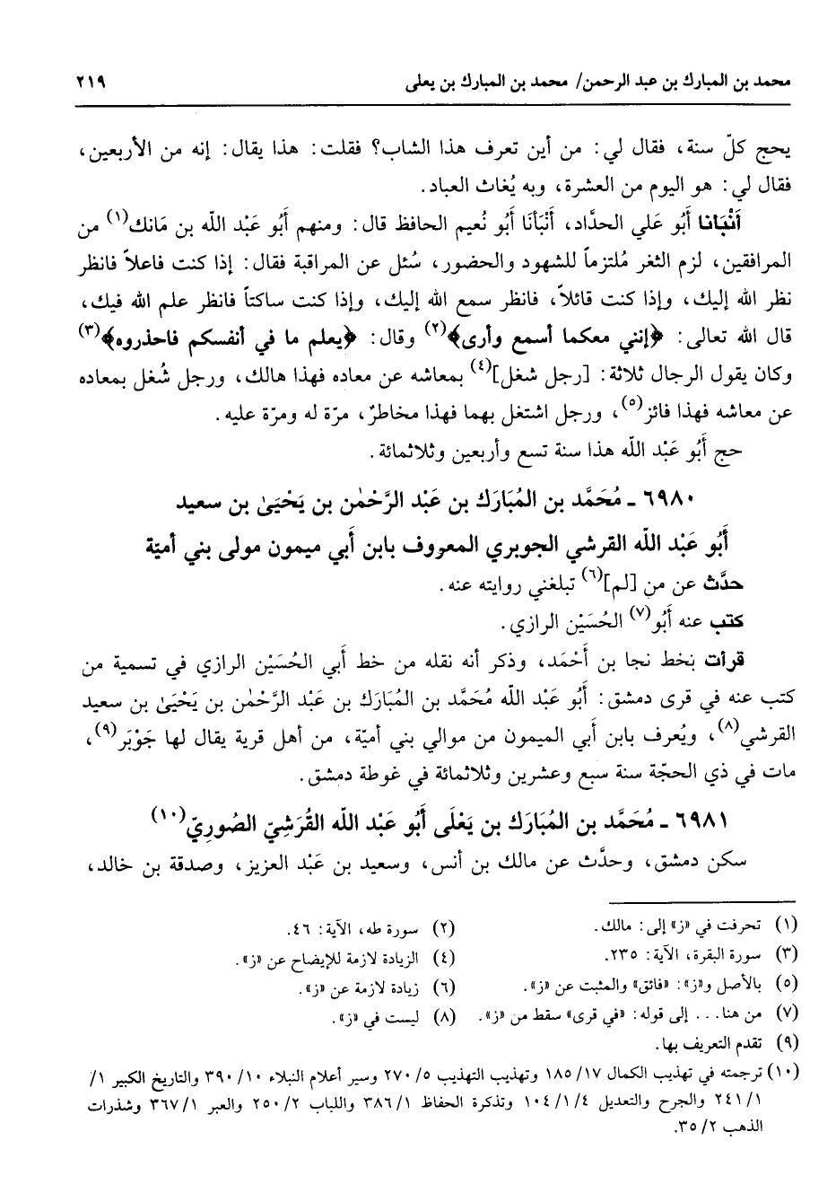 يحج كل سنة فقال لي من أين تعرف هذا الشاب فقلت هذا يقال إنه من الأربعين فقال لي هو اليوم من العشرة وبه يغاث العباد أنبأنا أبو علي الحداد أنبأنا أبو نعيم الحافظ قال ومنهم أبو عبد الله بن مانك (1) من المرافقين لزم الثغر ملتزما للشهود والحضور سئل عن المراقبة فقال إذا كنت فاعلا فانظر نظر الله إليك وإذا كنت قائلا فانظر سمع الله إليك وإذا كنت ساكتا فانظر علم الله فيك قال الله تعالى " إنني معكما أسمع وأرى " (2) وقال " يعلم ما في أنفسكم فاحذروه " (3) وكان يقول الرجال ثلاثة رجل [شغل] (4) بمعاشه عن معاده فهذا هالك ورجل شغل بمعاده عن معاشه فهذا فائز (5) ورجل اشتغل بهما فهذا مخاطر مرة له ومرة عليه حج أبو عبد الله هذا سنة تسع وأربعين وثلاثمائة 6980 - محمد بن المبارك بن عبد الرحمن بن يحيى بن سعيد أبو عبد الله القرشي الجوبري المعروف بابن أبي ميمون مولى بني أمية حدث عن من [لم] (6) تبلغني روايته عنه كتب عنه أبو (7) الحسين الرازي قرأت بخط نجا بن أحمد وذكر أنه نقله من خط أبي الحسين الرازي في تسمية من كتب عنه في قرى دمشق أبو عبد الله محمد بن المبارك بن عبد الرحمن بن يحيى بن سعيد القرشي (8) ويعرف بابن أبي الميمون من موالي بني أمية من أهل قرية يقال لها جوبر (9) مات في ذي الحجة سنة سبع وعشرين وثلاثمائة في غوطة دمشق 6981 - محمد بن المبارك بن يعلى أبو عبد الله القرشي الصوري (10) سكن دمشق وحدث عن مالك بن أنس وسعيد بن عبد العزيز وصدقة بن خالد