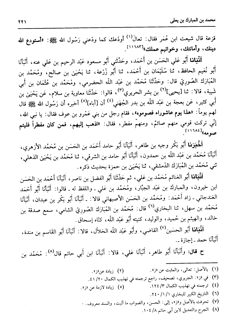 [11684] أخبرنا أبو بكر وجيه بن طاهر أنبأنا أبو حامد أحمد بن الحسن بن محمد الأزهري أنبأنا محمد بن عبد الله بن حمدون أنبأنا أبو حامد بن الشرقي ثنا محمد بن يحيى الذهلي ثنا محمد بن المبارك الدمشقي ثنا يحيى بن حمزة بحديث ذكره أنبأنا أبو الغنائم محمد بن علي ثم حدثنا أبو الفضل بن ناصر أنبأنا أحمد بن الحسن ابن خيرون والمبارك بن عبد الجبار ومحمد بن علي واللفظ له قالوا أنبأنا أبو أحمد الغندجاني زاد أحمد ومحمد بن الحسن الأصبهاني قالا أنبأنا أبو بكر بن عبدان أنبأنا محمد بن سهل ثنا البخاري (6) قال محمد بن المبارك الصوري الشامي سمع صدقة بن خالد والهيثم بن حميد والوليد كنيته أبو عبد الله كناه إسحاق أنبأنا أبو الحسين (7) القاضي وأبو عبد الله الخلال قالا أنبأنا أبو القاسم بن مندة أنبأنا حمد إجازة ح قال وأنبأنا أبو طاهر أنبأنا علي قالا أنبأنا ابن أبي حاتم قال (8) محمد بن