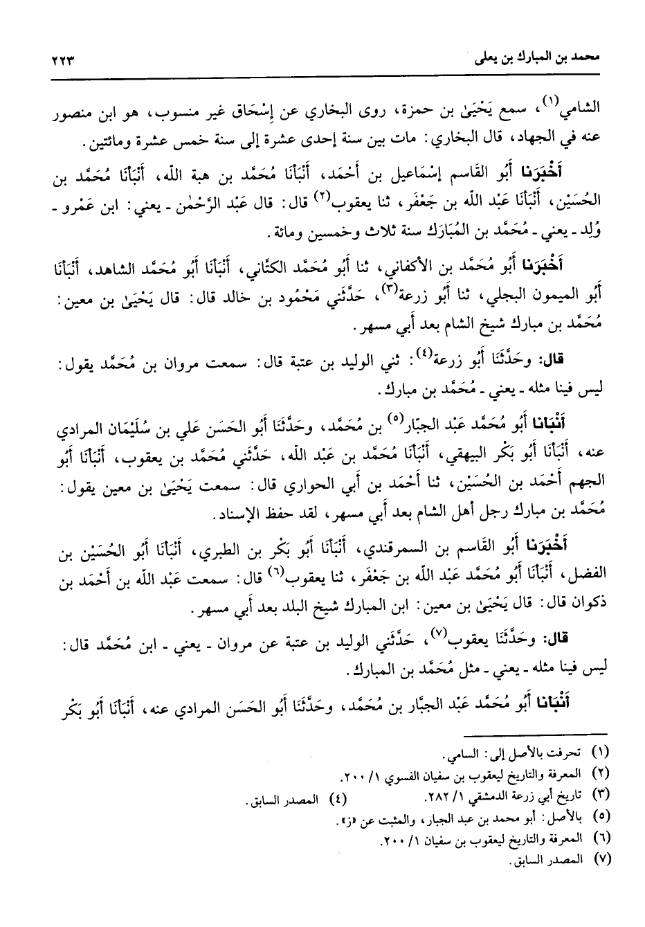 الشامي (1) سمع يحيى بن حمزة روى البخاري عن إسحاق غير منسوب هو ابن منصور عنه في الجهاد قال البخاري مات بين سنة إحدى عشرة إلى سنة خمس عشرة ومائتين أخبرنا أبو القاسم إسماعيل بن أحمد أنبأنا محمد بن هبة الله أنبأنا محمد بن الحسين أنبأنا عبد الله بن جعفر ثنا يعقوب (2) قال قال عبد الرحمن يعني ابن عمرو - ولد - يعني محمد بن المبارك سنة ثلاث وخمسين ومائة أخبرنا أبو محمد بن الأكفاني ثنا أبو محمد الكتاني أنبأنا أبو محمد الشاهد أنبأنا أبو الميمون البجلي ثنا أبو زرعة (3) حدثني محمود بن خالد قال قال يحيى بن معين: محمد بن مبارك شيخ الشام بعد أبي مسهر قال وحدثنا أبو زرعة (4) : ثني الوليد بن عتبة قال سمعت مروان بن محمد يقول: ليس فينا مثله يعني محمد بن مبارك أنبأنا أبو محمد عبد الجبار (5) بن محمد وحدثنا أبو الحسن علي بن سليمان المرادي عنه أنبأنا أبو بكر البيهقي أنبأنا محمد بن عبد الله حدثني محمد بن يعقوب أنبأنا أبو الجهم أحمد بن الحسين ثنا أحمد بن أبي الحواري قال سمعت يحيى بن معين يقول: محمد بن مبارك رجل أهل الشام بعد أبي مسهر لقد حفظ الإسناد أخبرنا أبو القاسم بن السمرقندي أنبأنا أبو بكر بن الطبري أنبأنا أبو الحسين بن الفضل أنبأنا أبو محمد عبد الله بن جعفر ثنا يعقوب (6) قال سمعت عبد الله بن أحمد بن ذكوان قال قال يحيى بن معين ابن المبارك شيخ البلد بعد أبي مسهر قال وحدثنا يعقوب (7) حدثني الوليد بن عتبة عن مروان يعني ابن محمد قال: ليس فينا مثله - يعني - مثل محمد بن المبارك أنبأنا أبو محمد عبد الجبار بن محمد وحدثنا أبو الحسن المرادي عنه أنبأنا أبو بكر