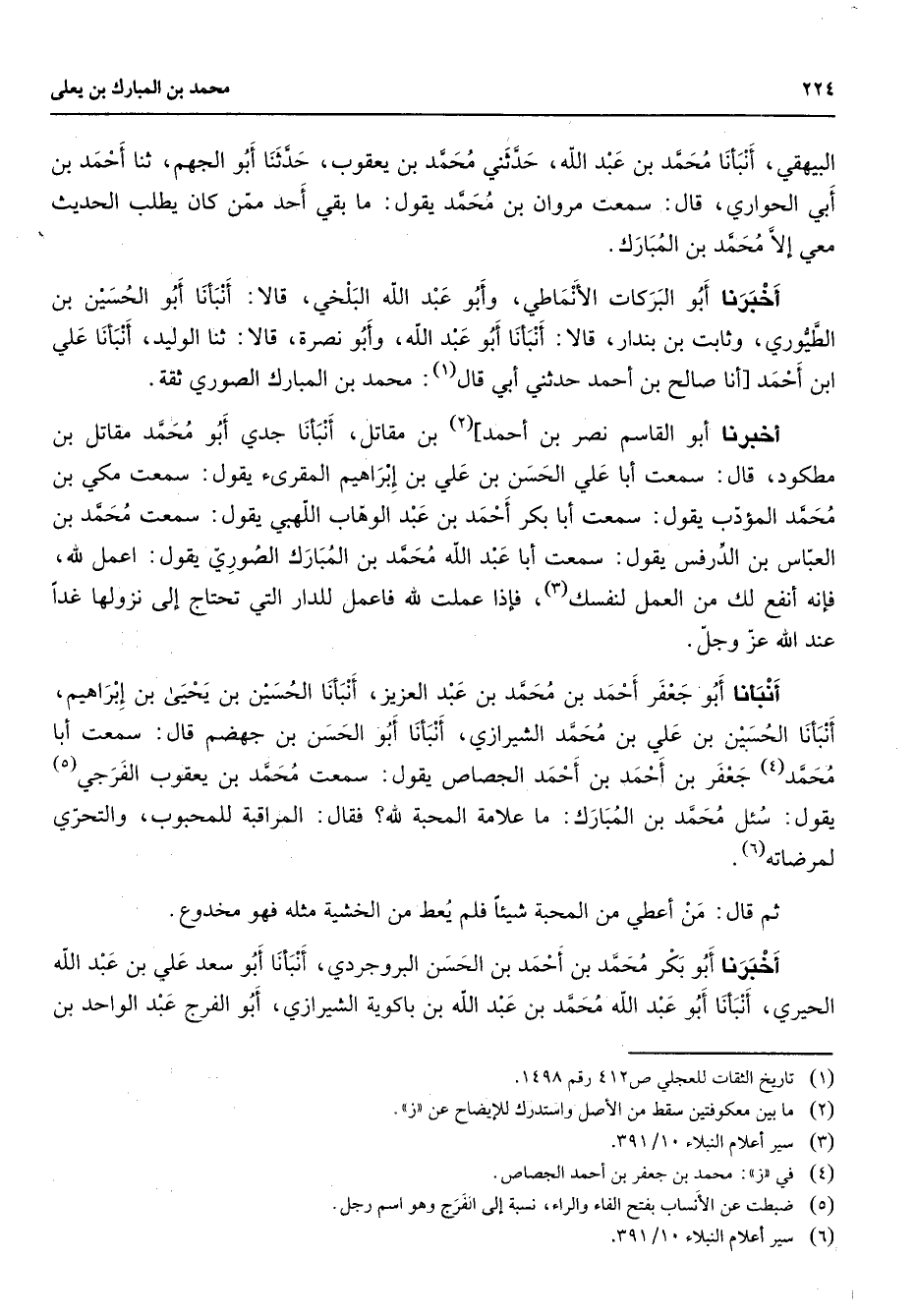 البيهقي أنبأنا محمد بن عبد الله حدثني محمد بن يعقوب حدثنا أبو الجهم ثنا أحمد بن أبي الحواري قال سمعت مروان بن محمد يقول ما بقي أحد ممن كان يطلب الحديث معي إلا محمد بن المبارك أخبرنا أبو البركات الأنماطي وأبو عبد الله البلخي قالا أنبأنا أبو الحسين بن الطيوري وثابت بن بندار قالا أنبأنا أبو عبد الله وأبو نصرة قالا ثنا الوليد أنبأنا علي ابن أحمد أنا صالح بن أحمد حدثني أبي قال (1) : محمد بن المبارك الصوري ثقة أخبرنا أبو القاسم نصر بن أحمد] (2) بن مقاتل أنبأنا جدي أبو محمد مقاتل بن مطكود قال سمعت أبا علي الحسن بن علي بن إبراهيم المقرئ يقول سمعت مكي بن محمد المؤدب يقول سمعت أبا بكر أحمد بن عبد الوهاب اللهبي يقول سمعت محمد بن العباس بن الدرفس يقول سمعت أبا عبد الله محمد بن المبارك الصوري يقول اعمل لله فإنه أنفع لك من العمل لنفسك (3) فإذا عملت لله فاعمل للدار التي تحتاج إلى نزولها غدا عند الله عز وجل أنبأنا أبو جعفر أحمد بن محمد بن عبد العزيز أنبأنا الحسين بن يحيى بن إبراهيم أنبأنا الحسين بن علي بن محمد الشيرازي أنبأنا أبو الحسن بن جهضم قال سمعت أبا محمد (4) جعفر بن أحمد بن أحمد الجصاص يقول سمعت محمد بن يعقوب الفرجي (5) يقول سئل محمد بن المبارك ما علامة المحبة لله فقال المراقبة للمحبوب والتحري لمرضاته (6) ثم قال من أعطي من المحبة شيئا فلم يعط من الخشية مثله فهو مخدوع أخبرنا أبو بكر محمد بن أحمد بن الحسن البروجردي أنبأنا أبو سعد علي بن عبد الله الحيري أنبأنا أبو عبد الله محمد بن عبد الله بن باكويه الشيرازي أبو الفرج عبد الواحد بن