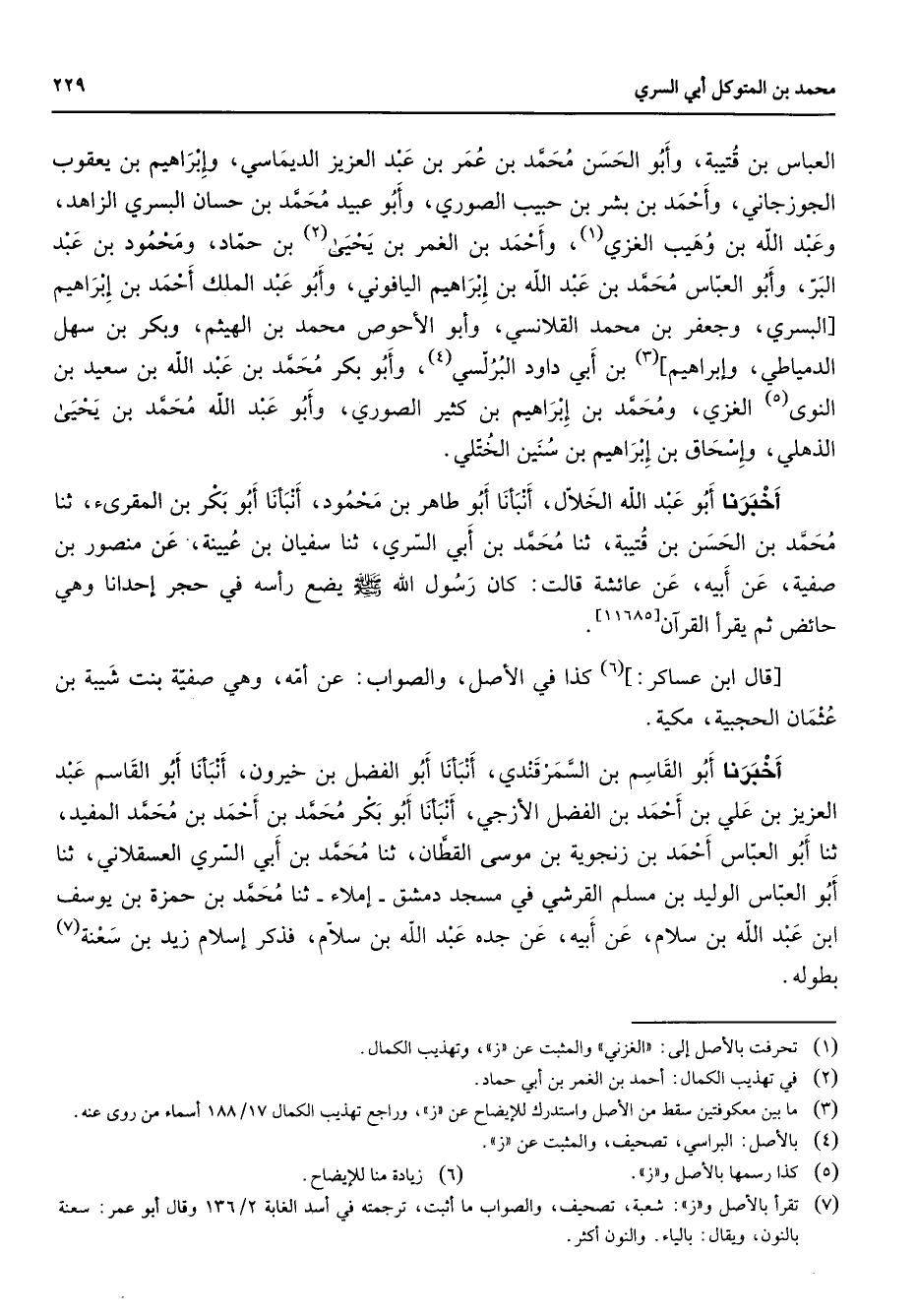 العباس بن قتيبة وأبو الحسن محمد بن عمر بن عبد العزيز الديماسي وإبراهيم بن يعقوب الجوزجاني وأحمد بن بشر بن حبيب الصوري وأبو عبيد محمد بن حسان البسري الزاهد وعبد الله بن وهب الغزي (1) وأحمد بن الغمر بن يحيى (2) بن حماد ومحمود بن عبد البر وأبو العباس محمد بن عبد الله بن إبراهيم اليافوني وأبو عبد الملك أحمد بن إبراهيم [البسري وجعفر بن محمد القلانسي وأبو الأحوص محمد بن الهيثم وبكر بن سهل الدمياطي وإبراهيم] (3) بن أبي داود البرلسي (4) وأبو بكر محمد بن عبد الله بن سعيد بن النوى (5) الغزي ومحمد بن إبراهيم بن كثير الصوري وأبو عبد الله محمد بن يحيى الذهلي وإسحاق بن إبراهيم بن سنين الختلي أخبرنا أبو عبد الله الخلال أنبأنا أبو طاهر بن محمود أنبأنا أبو بكر بن المقرئ ثنا محمد بن الحسن بن قتيبة ثنا محمد بن أبي السري ثنا سفيان بن عيينة عن منصور بن صفية عن أبيه عن عائشة قالت كان رسول الله (صلى الله عليه وسلم) يضع رأسه في حجر إحدانا وهي حائض ثم يقرأ القرآن