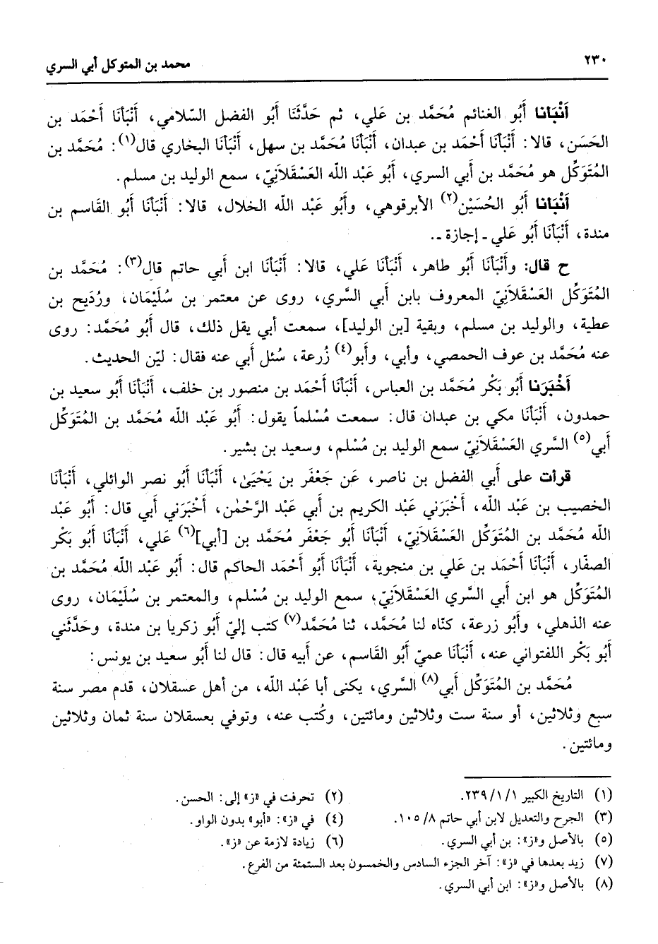 أنبأنا أبو الغنائم محمد بن علي ثم حدثنا أبو الفضل السلامي أنبأنا أحمد بن الحسن قالا أنبأنا أحمد بن عبدان أنبأنا محمد بن سهل أنبأنا البخاري قال (1) محمد بن المتوكل هو محمد بن أبي السري أبو عبد الله العسقلاني سمع الوليد بن مسلم أنبأنا أبو الحسين (2) الأبرقوهي وأبو عبد الله الخلال قالا أنبأنا أبو القاسم بن مندة أنبأنا أبو علي إجازة ح قال وأنبأنا أبو طاهر أنبأنا علي قالا أنبأنا ابن أبي حاتم قال (3) محمد بن المتوكل العسقلاني المعروف بابن أبي السري روى عن معتمر بن سليمان ورديح بن عطية والوليد بن مسلم وبقية [بن الوليد] سمعت أبي يقل ذلك قال أبو محمد روى عنه محمد بن عوف الحمصي وأبي وأبو (4) زرعة سئل أبي عنه فقال لين الحديث أخبرنا أبو بكر محمد بن العباس أنبأنا أحمد بن منصور بن خلف أنبأنا أبو سعيد بن حمدون أنبأنا مكي بن عبدان قال سمعت مسلما يقول أبو عبد الله محمد بن المتوكل أبي (5) السري العسقلاني سمع الوليد بن مسلم وسعيد بن بشير قرأت على أبي الفضل بن ناصر عن جعفر بن يحيى أنبأنا أبو نصر الوائلي أنبأنا الخصيب بن عبد الله أخبرني عبد الكريم بن أبي عبد الرحمن أخبرني أبي قال أبو عبد الله محمد بن المتوكل العسقلاني أنبأنا أبو جعفر محمد بن [أبي] (6) علي أنبأنا أبو بكر الصفار أنبأنا أحمد بن علي بن منجوية أنبأنا أبو أحمد الحاكم قال أبو عبد الله محمد بن المتوكل هو ابن أبي السري العسقلاني سمع الوليد بن مسلم والمعتمر بن سليمان روى عنه الذهلي وأبو زرعة كناه لنا محمد (7) ثنا محمد كتب إلي أبو زكريا بن مندة وحدثني أبو بكر اللفتواني عنه أنبأنا عمي أبو القاسم عن أبيه قال قال لنا أبو سعيد بن يونس: محمد بن المتوكل أبي (8) السري يكنى أبا عبد الله من أهل عسقلان قدم مصر سنة سبع وثلاثين أو سنة ست وثلاثين ومائتين وكتب عنه وتوفي بعسقلان سنة ثمان وثلاثين ومائتين
