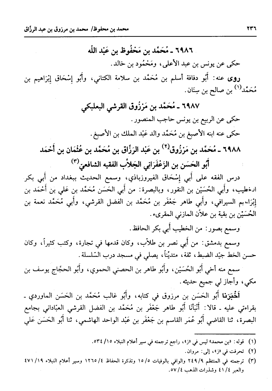 6986 - محمد بن محفوظ بن عبد الله حكى عن يونس بن عبد الأعلى ومحمود بن خالد روى عنه أبو دفافة أسلم بن محمد بن سلامة الكتاني وأبو إسحاق إبراهيم بن محمد (1) بن صالح بن سنان 6987 - محمد بن مرزوق القرشي البعلبكي حكى عن الربيع بن يونس حاجب المنصور حكى عنه ابنه الأصبغ بن محمد والد عبد الملك بن الأصبغ