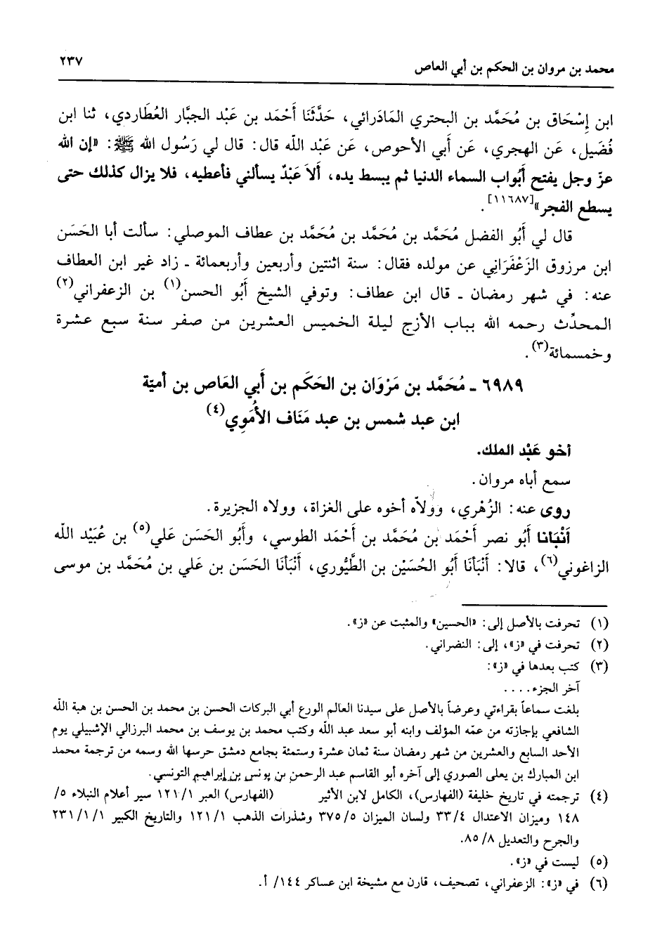 [11687] قال لي أبو الفضل محمد بن محمد بن محمد بن عطاف الموصلي سألت أبا الحسن ابن مرزوق الزعفراني عن مولده فقال سنة اثنتين وأربعين وأربعمائة زاد غير ابن العطاف عنه في شهر رمضان قال ابن عطاف وتوفي الشيخ أبو الحسن بن الزعفراني (2) المحدث رحمه الله بباب الأزج ليلة الخميس العشرين من صفر سنة سبع عشرة وخمسمائة (3) 6989 - محمد بن مروان بن الحكم بن أبي العاص بن أمية ابن عبد شمس بن عبد مناف الأموي (4) أخو عبد الملك سمع أباه مروان روى عنه الزهري وولاه أخوه على الغزاة وولاه الجزيرة أنبأنا أبو نصر أحمد بن محمد بن أحمد الطوسي وأبو الحسن علي (5) بن عبيد الله الزاغوني (6) قالا أنبأنا أبو الحسين بن الطيوري أنبأنا الحسن بن علي بن محمد بن موسى