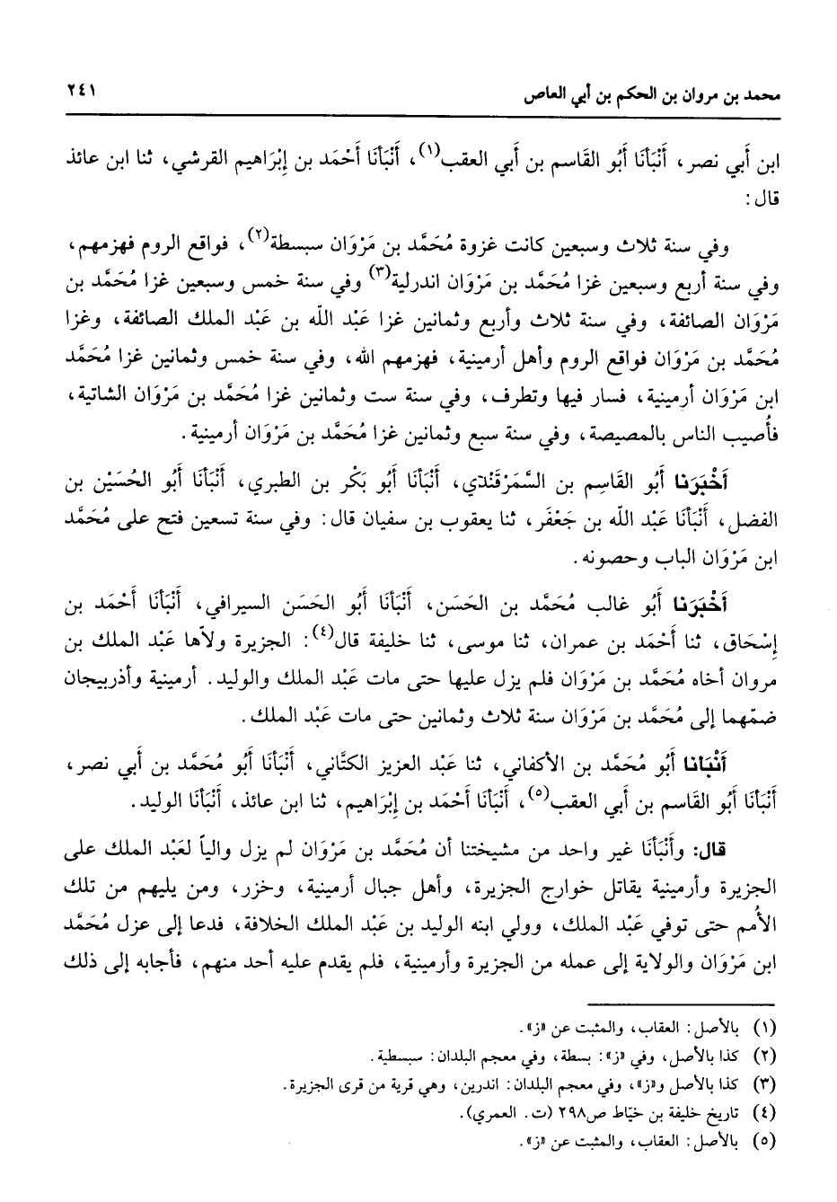 ابن أبي نصر أبو القاسم بن أبي العقب (1) أنبأنا أحمد بن إبراهيم القرشي ثنا ابن عائذ قال: وفي سنة ثلاث وسبعين كانت غزوة محمد بن مروان سبسطة (2) فواقع الروم فهزمهم وفي سنة أربع وسبعين غزا محمد بن مروان اندرلية (3) وفي سنة خمس وسبعين غزا محمد بن مروان الصائفة وفي سنة ثلاث وأربع وثمانين غزا عبد الله بن عبد الملك الصائفة وغزا محمد بن مروان فواقع الروم وأهل أرمينية فهزمهم الله وفي سنة خمس وثمانين غزا محمد ابن مروان أرمينية فسار فيها وتطرف وفي سنة ست وثمانين غزا محمد بن مروان الشاتية فأصيب الناس بالمصيصة وفي سنة سبع وثمانين غزا محمد بن مروان أرمينية أخبرنا أبو القاسم بن السمرقندي أنبأنا أبو بكر بن الطبري أنبأنا أبو الحسين بن الفضل أنبأنا عبد الله بن جعفر ثنا يعقوب بن سفيان قال وفي سنة تسعين فتح على محمد ابن مروان الباب وحصونه أخبرنا أبو غالب محمد بن الحسن أنبأنا أبو الحسن السيرافي أنبأنا أحمد بن إسحاق ثنا أحمد بن عمران ثنا موسى ثنا خليفة قال (4) : الجزيرة ولاها عبد الملك بن مروان أخاه محمد بن مروان فلم يزل عليها حتى مات عبد الملك والوليد أرمينية وأذربيجان ضمهما إلى محمد بن مروان سنة ثلاث وثمانين حتى مات عبد الملك أنبأنا أبو محمد بن الأكفاني ثنا عبد العزيز الكتاني أنبأنا أبو محمد بن أبي نصر أنبأنا أبو القاسم بن أبي العقب (5) أنبأنا أحمد بن إبراهيم ثنا ابن عائذ أنبأنا الوليد قال وأنبأنا غير واحد من مشيختنا أن محمد بن مروان لم يزل واليا لعبد الملك على الجزيرة وأرمينية يقاتل خوارج الجزيرة وأهل جبال أرمينية وخزر ومن يليهم من تلك الأمم حتى توفي عبد الملك وولى ابنه الوليد بن عبد الملك الخلافة فدعا إلى عزل محمد ابن مروان والولاية إلى عمله من الجزيرة وأرمينية فلم يقدم عليه أحد منهم فأجابه إلى ذلك