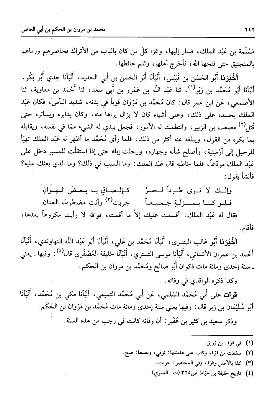 مسلمة بن عبد الملك فسار إليها وغزا كل من كان بالباب من الأتراك فحاصرهم ورماهم بالمنجنيق حتى فتحها الله فأخرج أهلها وثلم حائطها أخبرنا أبو الحسن بن قبيس أنبأنا أبو الحسن بن أبي الحديد أنبأنا جدي أبو بكر أنبأنا أبو محمد بن زبر (1) ثنا عبد الله بن عمرو بن أبي سعد ثنا أحمد بن معاوية ثنا الأصمعي عن ابن عمر قال كان محمد بن مروان قويا في بدنه شديد البأس فكان عبد الملك يحسده على ذلك وعلى أشياء كان لا يزال يراها منه وكان يدابره ويساتره حتى قتل (2) مصعب بن الزبير وانتطمت له الأمور فجعل يبدي له الشئ مما في نفسه ويقابله بما يكره من القول ويبلغه عنه أكثر من ذلك فلما رأى محمد ما أظهر له عبد الملك تهيأ للرحيل إلى أرمينية وأصلح شأنه وجهازه ورحلت إبله حتى إذا استقلت للمسير دخل على عبد الملك مودعا فلما خاطبه قال عبد الملك وما السبب في ذلك وما الذي بعثك عليه؟ فأنشأ يقول: وإنك لا ترى طردا لحر * كإلصاق به بعض الهوان فلو كنا بمنزلة جميعا * جريت (3) وأنت مضطرب العنان