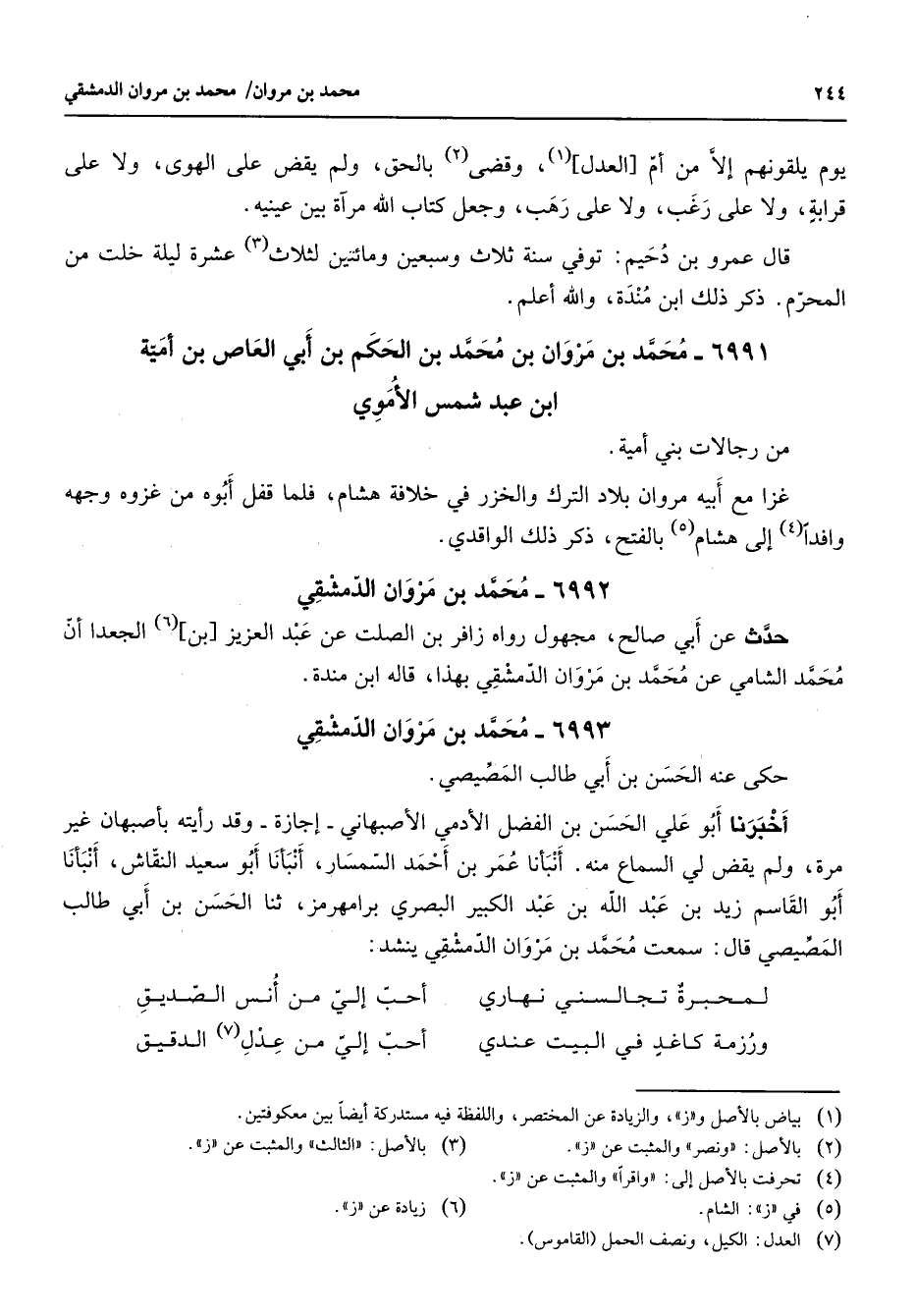 يوم يلقونهم إلا من أم [العدل] (1) وقضى (2) بالحق ولم يقض على الهوى ولا على قرابة ولا على رغب ولا على رهب وجعل كتاب الله مرآة بين عينيه قال عمرو بن دحيم توفي سنة ثلاث وسبعين ومائتين لثلاث (3) عشرة ليلة خلت من المحرم ذكر ذلك ابن مندة والله أعلم 6991 - محمد بن مروان بن محمد بن الحكم بن أبي العاص بن أمية ابن عبد شمس الأموي من رجالات بني أمية غزا مع أبيه مروان بلاد الترك والخزر في خلافة هشام فلما قفل أبوه من غزوه وجهه وافدا (4) إلى هشام (5) بالفتح ذلك الواقدي 6992 - محمد بن مروان الدمشقي حدث عن أبي صالح مجهول رواه زافر بن الصلت عن عبد العزيز [بن] (6) الجعدا أن محمد الشامي عن محمد بن مروان الدمشقي بهذا قاله ابن منذة 6993 - محمد بن مروان الدمشقي حكى عنه الحسن بن أبي طالب المصيصي أخبرنا أبو علي الحسن بن الفضل الأدمي الأصبهاني إجازة وقد رأيته بأصبهان غير مرة ولم يقض لي السماع منه أنبأنا عمر بن أحمد السمسار أنبأنا أبو سعيد النقاش أنبأنا أبو القاسم زيد بن عبد الله بن عبد الكبير البصري برامهرمز ثنا الحسن بن أبي طالب المصيصي قال سمعت محمد بن مروان الدمشقي ينشد: لمحبرة تجالسني نهاري * أحب إلي من أنس الصديق ورزمة كاغد في البيت عندي * أحب إلي من عدل (7) الدقيق
