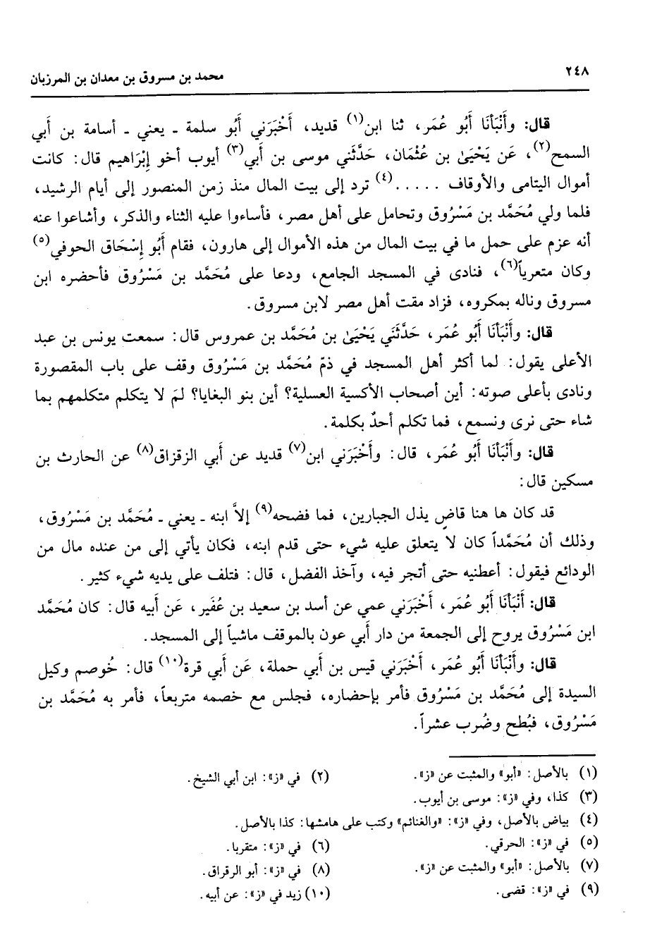 (4) ترد إلى بيت المال منذ زمن المنصور إلى أيام الرشيد فلما ولي محمد بن مسروق وتحامل على أهل مصر فأساءوا عليه الثناء والذكر وأشاعوا عنه أنه عزم على حمل ما في بيت المال من هذه الأموال إلى هارون فقام أبو إسحاق الحوفي (5) وكان متعريا (6) فنادى في المسجد الجامع ودعا على محمد بن مسروق فأحضره ابن مسروق وناله بمكروه فزاد مقت أهل مصر لابن مسروق قال وأنبأنا أبو عمر حدثني يحيى بن محمد بن عمروس قال سمعت يونس بن عبد الأعلى يقول لما أكثر أهل المسجد في ذم محمد بن مسروق وقف على باب المقصورة ونادى بأعلى صوته أين أصحاب الأكسية العسلية أين بنو البغايا لم لا يتكلم متكلمهم بما شاء حتى نرى ونسمع فما تكلم أحد بكلمة قال وأنبأنا أبو عمر قال وأخبرني ابن (7) قديد عن أبي الزقزاق (8) عن الحارث بن مسكين قال قد كان ها هنا قاض يذل الجبارين فما فضحه (9) إلا ابنه يعني محمد بن مسروق وذلك أن محمدا كان لا يتعلق عليه شئ حتى قدم ابنه فكان يأتي إلى من عنده مال من الودائع فيقول أعطنيه حتى أتجر فيه وآخذ الفضل قال فتلف على يديه شئ كثير قال أنبأنا أبو عمر أخبرني عمي عن أسد بن سعيد بن عفير عن أبيه قال كان محمد ابن مسروق يروح إلى الجمعة من دار أبي عون بالموقف ماشيا إلى المسجد قال وأنبأنا أبو عمر أخبرني قيس بن أبي حملة عن أبي قرة (10) قال خوصم وكيل السيدة إلى محمد بن مسروق فأمر بإحضاره فجلس مع خصمه متربعا فأمر به محمد بن مسروق فبطح وضرب عشرا