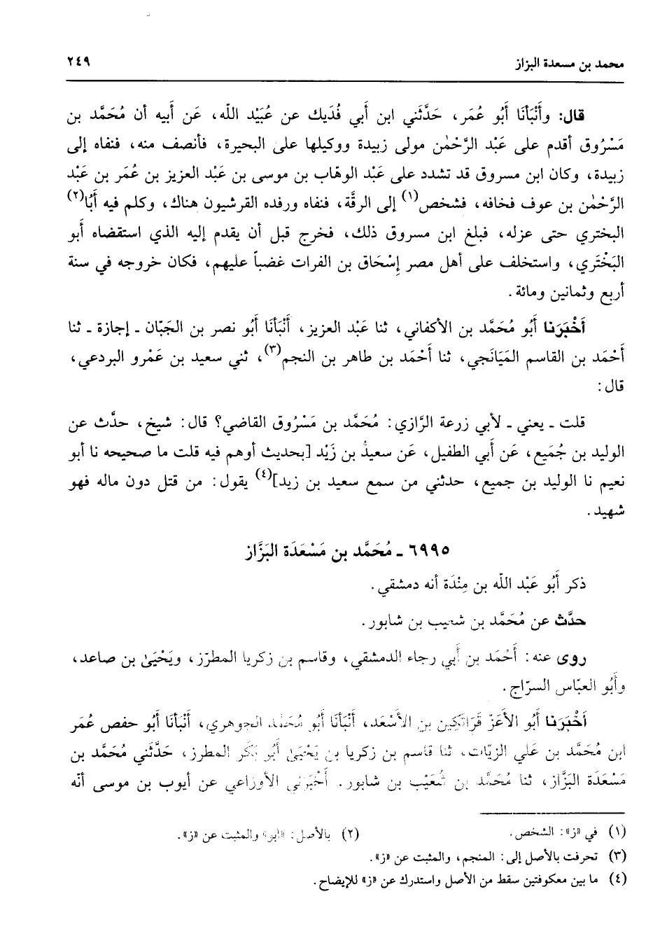 6995 - محمد بن مسعدة البزاز ذكر أبو عبد الله بن مندة أنه دمشقي حدث عن محمد بن شعيب بن شابور روى عنه أحمد بن أبي رجاء الدمشقي وقاسم بن زكريا المطرز ويحيى بن صاعد وأبو العباس السراج أخبرنا أبو الأعز قراتكين بن الأسعد أنبأنا أبو محمد الجوهري أنبأنا أبو حفص عمر ابن محمد بن علي الزيات ثنا قاسم بن زكريا بن يحيى أبو بكر المطرز حدثني محمد بن مسعدة البزاز ثنا محمد بن شعيب بن شابور أخبرني الأوزاعي عن أيوب بن موسى أنه