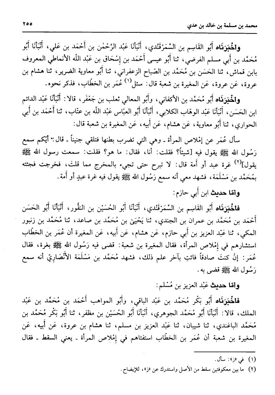 وأخبرناه أبو القاسم بن السمرقندي أنبأنا عبد الرحمن بن أحمد بن علي أنبأنا أبو محمد بن أبي مسلم الفرضي ثنا أبو عيسى أحمد بن إسحاق بن عبد الله الأنماطي المعروف بابن قماش ثنا الحسن بن محمد بن الصباح الزعفراني ثنا أبو معاوية الضرير ثنا هشام بن عروة عن عروة عن المغيرة بن شعبة قال سئل (1) عمر بن الخطاب فذكر نحوه وأخبرناه أبو محمد بن الأكفاني وأبو المعالي ثعلب بن جعفر قالا أنبأنا عبد الدائم ابن الحسن أنبأنا عبد الوهاب الكلابي أنبأنا أبو العباس عبد الله بن عتاب ثنا أحمد بن أبي الحواري ثنا أبو معاوية عن هشام عن أبيه عن المغيرة بن شعبة قال: سأل عمر عن إملاص المرأة وهي التي تضرب بطنها فتلقي جنينا قال أيكم سمع رسول الله (صلى الله عليه وسلم) يقول فيه شيئا فقلت أنا فقال ما هو فقلت سمعت رسول الله (صلى الله عليه وسلم) يقول] (2) غرة عبد أو أمة قال لا تبرح حتى تجئ بالمخرج مما قلت فخرجت فجئته بمحمد بن مسلمة فشهد معي أنه سمع رسول الله (صلى الله عليه وسلم) يقول فيه غرة عبد أو أمة واما حديث ابن أبي حازم: فأخبرناه أبو القاسم بن السمرقندي أنبأنا أبو الحسين بن النقور أنبأنا أبو الحسن أحمد بن محمد بن عمران بن الجندي ثنا يحيى بن محمد بن صاعد ثنا محمد بن زنبور المكي ثنا عبد العزيز بن أبي حازم عن هشام عن أبيه عن المغيرة أن عمر بن الخطاب استشارهم في إملاص المرأة فقال المغيرة بن شعبة قضى فيه رسول الله (صلى الله عليه وسلم) بغرة فقال عمر إن كنت صادقا فائت بآخر علم ذلك فشهد محمد بن مسلمة الأنصاري أنه سمع رسول الله (صلى الله عليه وسلم) قضى به وأما حديث عبد العزيز بن مسلم: فأخبرناه أبو بكر محمد بن عبد الباقي وأبو المواهب أحمد بن محمد بن عبد الملك قالا أنبأنا أبو محمد الجوهري أنبأنا أبو الحسين بن مظفر ثنا أبو بكر محمد بن محمد الباغندي ثنا شيبان ثنا عبد العزيز بن مسلم ثنا هشام بن عروة عن أبيه عن المغيرة بن شعبة أن عمر بن الخطاب استفتاهم في إملاص المرأة يعني السقط فقال