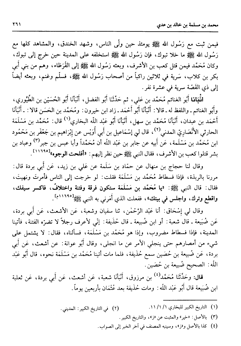 فيمن ثبت مع رسول الله (صلى الله عليه وسلم) يومئذ حين ولى الناس وشهد الخندق والمشاهد كلها مع رسول الله (صلى الله عليه وسلم) ما خلا تبوك فإن رسول الله (صلى الله عليه وسلم) استخلفه على المدينة حين خرج إلى تبوك وكان محمد فيمن قتل كعب بن الأشرف وبعثه رسول الله (صلى الله عليه وسلم) إلى القرظاء وهم من بني أبي بكر بن كلاب سرية في ثلاثين راكبا من أصحاب رسول الله (صلى الله عليه وسلم) فسلم وغنم وبعثه أيضا إلى ذي القصة سرية في عشرة نفر أنبأنا أبو الغنائم محمد بن علي ثم حدثنا أبو الفصل أنبأنا أبو الحسين بن الطيوري وأبو الغنائم واللفظ له قالا أنبأنا أبو أحمد زاد ابن خيرون ومحمد بن الحسن قالا أنبأنا أحمد بن عبدان أنبأنا محمد بن سهل أنبأنا أبو عبد الله البخاري (1) قال محمد بن مسلمة الحارثي الأنصاري المدني (2) قال لي إسماعيل بن أبي أويس عن إبراهيم بن جعفر بن محمود ابن محمد بن مسلمة عن أبيه عن جابر بن عبد الله أن محمدا وأبا عبس بن جبر (3) وعباد بن بشر قتلوا كعب بن الأشرف فقال النبي (صلى الله عليه وسلم) حين نظر إليهم " أفلحت الوجوه "