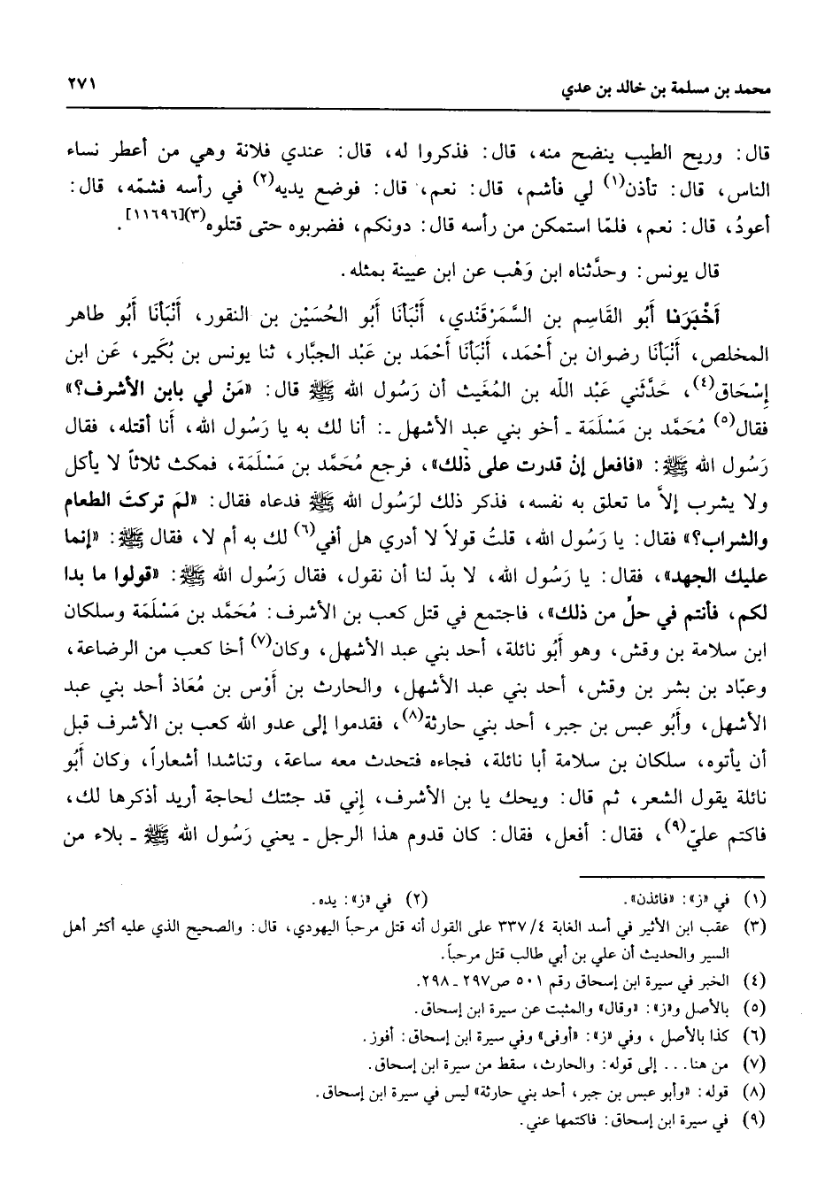 [11696] (3) قال يونس وحدثناه ابن وهب عن ابن عيينة بمثله أخبرنا أبو القاسم بن السمرقندي أنبأنا أبو الحسين بن النقور أنبأنا أبو طاهر المخلص أنبأنا رضوان بن أحمد أنبأنا أحمد بن عبد الجبار ثنا يونس بن بكير عن ابن إسحاق (4) حدثني عبد الله بن المغيث أن رسول الله (صلى الله عليه وسلم) قال " من لي بابن الأشرف " فقال (5) محمد بن مسلمة أخو بني عبد الأشهل أنا لك به يا رسول الله أنا أقتله فقال رسول الله (صلى الله عليه وسلم) " فافعل إن قدرت على ذلك " فرجع محمد بن مسلمة فمكث ثلاثا لا يأكل ولا يشرب إلا ما تعلق به نفسه فذكر ذلك لرسول الله (صلى الله عليه وسلم) فدعاه فقال " لم تركت الطعام والشراب " فقال يا رسول الله قلت قولا لا أدري هل أفي (6) لك به أم لا فقال (صلى الله عليه وسلم) " إنما عليك الجهد " فقال يا رسول الله لا بد لنا أن نقول فقال رسول الله (صلى الله عليه وسلم) " قولوا ما بدا لكم فأنتم في حل من ذلك " فاجتمع في قتل كعب بن الأشرف محمد بن مسلمة وسلكان ابن سلامة بن وقش وهو أبو نائلة أحد بني عبد الأشهل وكان (7) أخا كعب من الرضاعة وعباد بن بشر بن وقش أحد بني عبد الأشهل والحارث بن أوس بن معاذ أحد بني عبد الأشهل وأبو عبس بن جبر أحد بني حارثة (8) فقدموا إلى عدو الله كعب بن الأشرف قبل أن يأتوه سلكان بن سلامة أبا نائلة فجاءه فتحدث معه ساعة وتناشدا أشعارا وكان أبو نائلة يقول الشعر ثم قال ويحك يا بن الأشرف إني قد جئتك لحاجة أريد ذكرها لك فاكتم علي (9) فقال أفعل فقال كان قدوم هذا الرجل يعني رسول الله (صلى الله عليه وسلم) بلاء من
