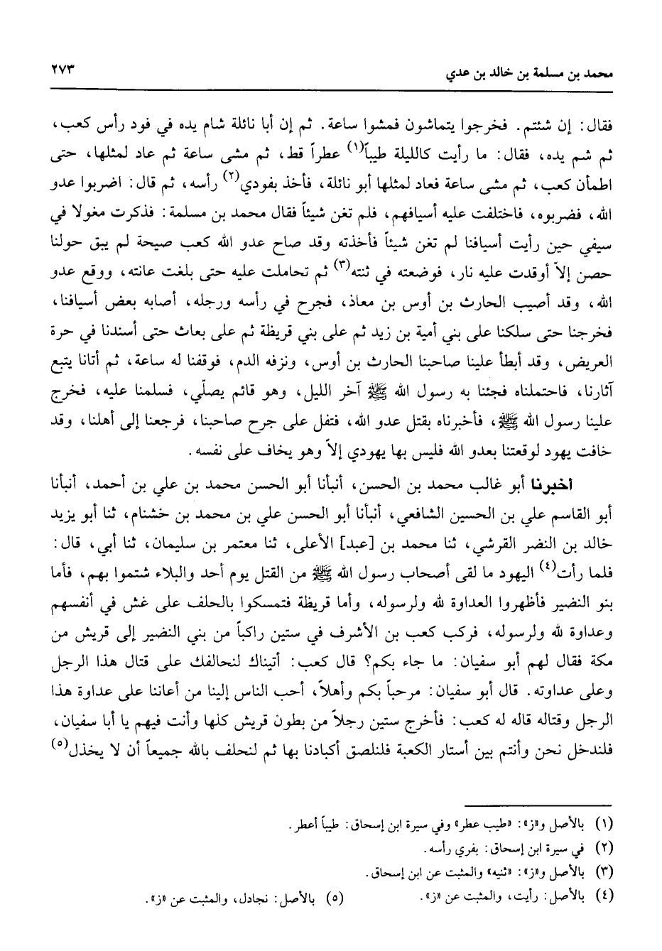 فقال إن شئتم فخرجوا يتماشون فمشوا ساعة ثم إن أبا نائلة شام يده في فود رأس كعب ثم شم يده فقال ما رأيت كالليلة طيبا (1) عطرا قط ثم مشى ساعة ثم عاد لمثلها حتى اطمأن كعب ثم مشى ساعة فعاد لمثلها أبو نائلة فأخذ بفودي (2) راسه ثم قال اضربوا عدو الله فضربوه فاختلفت عليه أسيافهم فلم تغن شيئا فقال محمد ين مسلمة فذكرت مغولا في سيفي حين رأيت أسيافنا لم تغن شيئا فأخذته وقد صاح عدو الله كعب صيحة لم يبق حولنا حصن إلا أوقدت عليه نار فوضعته في ثنته (3) ثم تحاملت عليه حتى بلغت عانته ووقع عدو الله وقد أصيب الحارث بن أوس بن معاذ فجرح في راسه ورجله أصابه بعض أسيافنا فخرجنا حتى سلكنا على بني أمية بن زيد ثم على بني قريظة ثم على بعاث حتى أسندنا في حرة العريض وقد ابطأ علينا صاحبنا الحارث بن أوس ونزفه الدم فوقفنا له ساعة ثم أتانا يتبع آثارنا فاحتملناه فجئنا به رسول الله (صلى الله عليه وسلم) آخر الليل وهو قائم يصلي فسلمنا عليه فخرج علينا رسول الله (صلى الله عليه وسلم) فأخبرناه بقتل عدو الله فتفل على جرح صاحبنا فرجعنا إلى أهلنا وقد خافت يهود لوقعتنا بعدو الله فليس بها يهودي إلا وهو يخاف على نفسه أخبرنا أبو غالب محمد بن الحسن أنبأنا أبو الحسن محمد بن علي بن أحمد أنبأنا أبو القاسم علي بن الحسين الشافعي أنبأنا أبو الحسن علي بن محمد بن خشنام ثنا أبو يزيد خالد بن النضر القرشي ثنا محمد بن عبد الأعلى ثنا معتمر بن سليمان ثنا أبي قال فلما رأت (4) اليهود ما لقى أصحاب رسول الله (صلى الله عليه وسلم) من القتل يوم أحد والبلاء شتموا بهم فأما بنو النضير فأظهروا العداوة لله ولرسوله وأما قريظة فتمسكوا بالحلف على غش في أنفسهم وعداوة لله ولرسوله فركب كعب بن الأشرف في ستين راكبا من بني النضير إلى قريش من مكة فقال لهم أبو سفيان ما جاء بكم قال كعب أتيناك لنحالفك على قتال هذا الرجل وعلى عداوته قال أبو سفيان مرحبا بكم وأهلا أحب الناس إلينا من أعاننا على عداوة هذا الرجل وقتاله قاله له كعب فأخرج ستين رجلا من بطون قريش كلها وأنت فيهم يا أبا سفيان فلندخل نحن وأنتم بين أستار الكعبة فلنلصق أكبادنا بها ثم لنحلف بالله جميعا أن لا يخذل (5)
