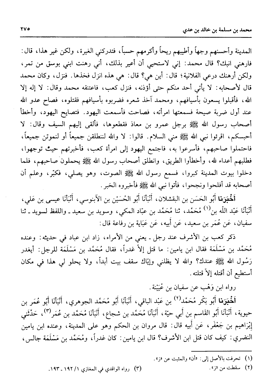 المدينة وأحسنهم وجها وأطيبهم ريحا وأكرمهم حسبا فتدركني الغيرة ولكن غير هذا قال فارهني اتبك قال محمد إني لأستحيي أن أعير بذلك أني رهنت ابني بوسق من تمر ولكن أرهنك درعي الفلانية قال أين هي قال هي هذه انزل فخذها فنزل وكان محمد قال لأصحابه لا يأتي أحد منكم حتى أؤذنه فنزل كعب فاعتنقه محمد وقال لا إله إلا الله فأقبلوا يسعون بأسيافهم ومحمد آخذ شعره فضربوه باسيافهم فقتلوه فصاح عدو الله عند أول ضربة صيحة فسمعتها امرأته فصاحت فأسمعت اليهود فتصايح اليهود وأخطأ أصحاب رسول الله (صلى الله عليه وسلم) برجل عمرو بن معاذ فقطعوها فألقى إليهم السيف وقال لا أحبسكم اقرئوا نبي الله (صلى الله عليه وسلم) مني السلام قالوا لا والله لننطلقن جميعا أو لنموتن جميعا فاحتملوا صاحبهم فأسرعوا به فاجتمع اليهود إلى امرأة كعب فأخبرتهم حيث توجهوا فطلبهم أعداء لله وأخطأوا الطريق وانطلق أصحاب رسول الله (صلى الله عليه وسلم) يحملون صاحبهم فلما دخلوا بيوت المدينة كبروا فسمع رسول الله (صلى الله عليه وسلم) الصوت وهو يصلي فكبر وعلم أن أصحابه قد أفلحوا ونجحوا فأتوا نبي الله (صلى الله عليه وسلم) فأخبروه الخبر أخبرنا أبو الحسن بن البقشلان أنبأنا أبو الحسين بن الآبنوسي أنبأنا عيسى بن علي أنبأنا عبد الله بن (1) محمد ثنا محمد بن عباد المكي وسويد بن سعيد واللفظ لسويد ثنا سفيان عن عمر بن سعيد عن أبيه عن عباية بن رفاعة قال: ذكر كعب بن الأشرف عند رجل يعني من الأمراء زاد ابن عباد في حديثه وعنده محمد بن مسلمة فقال ابن يامين ما قتل إلا غدرا فقال محمد بن مسلمة للرجل أيغدر رسول الله (صلى الله عليه وسلم) عندك والله لا يظلني وإياك سقف بيت أبدا ولا يحلو لي هذا في مكان أستطيع أن أقتله إلا قتلته رواه ابن وهب عن سفيان بن عيينة أخبرنا أبو بكر محمد (2) بن عبد الباقي أنبأنا أبو محمد الجوهري أنبأنا أبو عمر بن حيوية أنبأنا أبو القاسم بن أبي حية أنبأنا محمد بن شجاع أنبأنا محمد بن عمر (3) حدثني إبراهيم بن جعفر عن أبيه قال قال مروان بن الحكم وهو على المدينة وعنده ابن يامين النضري كيف كان قتل ابن الأشرف قال ابن يامين كان غدرا ومحمد بن مسلمة جالس