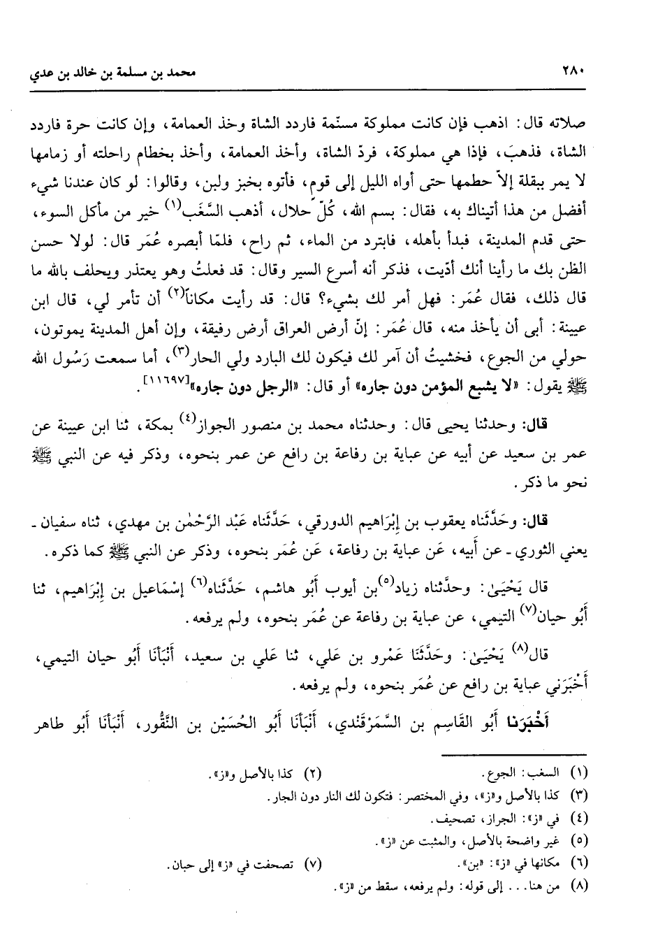 صلاته قال اذهب فإن كانت مملوكة مسنمة فاردد الشاة وخذ العمامة وإن كانت حرة فاردد الشاة فذهب فإذا هي مملوكة فرد الشاة وأخذ العمامة وأخذ بخطام راحلته أو زمامها لا يمر ببقلة إلا حطمتها حتى أواه الليل إلى قوم فأتوه بخبز ولبن وقالوا لو كان عندنا شئ أفضل من هذا أتيناك به فقال بسم الله كل خلال أذهب السغب (1) خير من مأكل السوء حتى قدم المدينة بدأ بأهله فابترد من الماء ثم راح فلما أبصره عمر قال لولا حسن الظن بك ما رأينا أنك أديت فذكر أنه أسرع السير وقال قد فعلت وهو يعتذر ويحلف بالله ما قال ذلك فقال عمر فهل أمر لك بشئ قال قد رأيت مكانا (2) أن تأمر لي قال ابن عيينة أبى أن يأخذ منه قال عمر إن أرض العراق أرض رفيقة وإن أهل المدينة يموتون حولي من الجوع فخشيت أن آمر لك فيكون لك البارد ولي الحار (3) أما سمعت رسول الله (صلى الله عليه وسلم) يقول " لا يشبع المؤمن دون جاره " أو قال " الرجل دون جاره "
