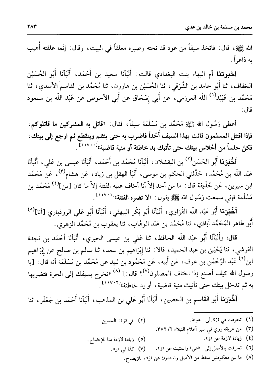 [11701] أخبرنا أبو عبد الله الفراوي أنبأنا أبو بكر البيهقي أنبأنا أبو علي الروذباري [أنا] (5) أبو طاهر المحمد آباذي ثنا محمد بن عبد الوهاب ثنا يعقوب بن محمد الزهري قال وانبأنا أبو عبد الله الحافظ ثنا علي بن عيسى الحيري أنبأنا أحمد بن نجدة القرشي ثنا يحيى بن عبد الحميد قالا ثنا إبراهيم بن سعد ثنا سالم بن صالح عن إبراهيم ابن (6) عبد الرحمن بن عوف عن أبيه عن محمود بن لبيد عن محمد بن مسلمة أنه قال [يا رسول الله كيف أصنع إذا اختلف المصلون (7) قال:] (8) " تخرج بسيفك إلى الحرة فتضربها به ثم تدخل بيتك حتى تأتيك منية قاضية أو يد خاطئة
