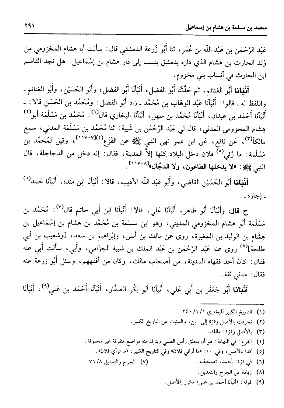 عبد الرحمن بن عبد الله بن عمر ثنا أبو زرعة الدمشقي قال سألت أبا هشام المخزومي من ولد الحارث بن هشام الذي داره بدمشق ينسب إلى دار هشام بن إسماعيل هل تجد القاسم ابن الحارث في أنساب بني مخزوم أنبأنا أبو الغنائم ثم حدثنا أبو الفضل أنبأنا أبو الفضل وأبو الحسين وأبو الغنائم واللفظ له قالوا أنبأنا عبد الوهاب بن محمد زاد أبو الفضل ومحمد بن الحسن قالا أنبأنا أحمد بن عبدان أنبأنا محمد بن سهل أنبأنا البخاري قال (1) محمد بن مسلمة أبو (2) هشام المخزومي المدني قال لي عبد الرحمن بن شيبة ثنا محمد بن مسلمة المدني سمع مالكا (3) عن نافع عن ابن عمر نهى النبي (صلى الله عليه وسلم) عن القزع (4)
