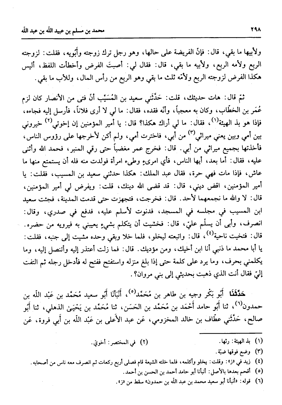 ولأبيها ما بقي قال فإن الفريضة على حالها وهو رجل ترك زوجته وأبويه فقلت لزوجته الربع ولأمه الربع ولأبيه ما بقي قال فقال لي أصبت الفرض وأخطأت اللفظ أليس هكذا الفرض لزوجته الربع ولأمه ثلث ما بقي وهو الربع من رأس المال وللأب ما بقي ثم قال هات حديثك قلت حدثني سعيد بن المسيب أن فتى من الأنصار كان لزم عمر بن الخطاب وكان به معجبا وأنه فقده فقال ما لي لا أرى فلانا فأرسل إليه فجاءه فإذا هو بذ الهيئة (1) فقال ما لي أراك هكذا قال يا أمير المؤمنين إن إخوتي (2) خيروني بين أمي وبين يعني ميراثي (3) من أبي فاخترت أمي ولم أكن لأخرجها على رؤوس الناس فأخذتها بجميع ميراثي من أبي قال فخرج عمر مغضبا حتى رقي المنبر فحمد الله وأثنى عليه فقال أما بعد أيها الناس فأي امرئ وطئ امرأة فولدت منه فله أن يستمتع منها ما عاش فإذا مات فهي حرة فقال عبد الملك هكذا حدثني سعيد بن المسيب فقلت يا أمير المؤمنين اقض ديني قال قضى الله دينك قلت ويفرض لي أمير المؤمنين قال لا والله ما نجمعهما لأحد قال فخرجت فتجهزت حتى قدمت المدينة فجئت سعيد ابن المسيب في مجلسه في المسجد فدنوت لأسلم عليه فدفع في صدري وقال انصرف وأبى أن يسلم علي قال فخشيت أن يتكلم بشئ يعيبني به فيرويه من حضره قال فتخيت ناحية (4) واتبعته ليخلو فلما خلا وبقي وحده مشيت إلى جنبه فقلت يا أبا محمد ما ذنبي أنا ابن أخيك ومن مؤديك قال فما زلت أعتذر إليه وأتنصل إليه وما يكلمني بحرف وما يرد على كلمة حتى إذا بلغ منزله واستفتح ففتح له فأدخل رجله ثم التفت إلي فقال أنت الذي ذهبت بحديثي إلى بني مروان؟ حدثنا أبو بكر وجيه بن طاهر بن محمد (5) أنبأنا أبو سعيد محمد بن عبد الله بن حمدون (6) ثنا أبو حامد أحمد بن محمد بن الحسن ثنا محمد بن يحيى الذهلي ثنا أبو صالح حدثني عطاف بن خالد المخزومي عن عبد الأعلى بن عبد الله بن أبي فروة عن