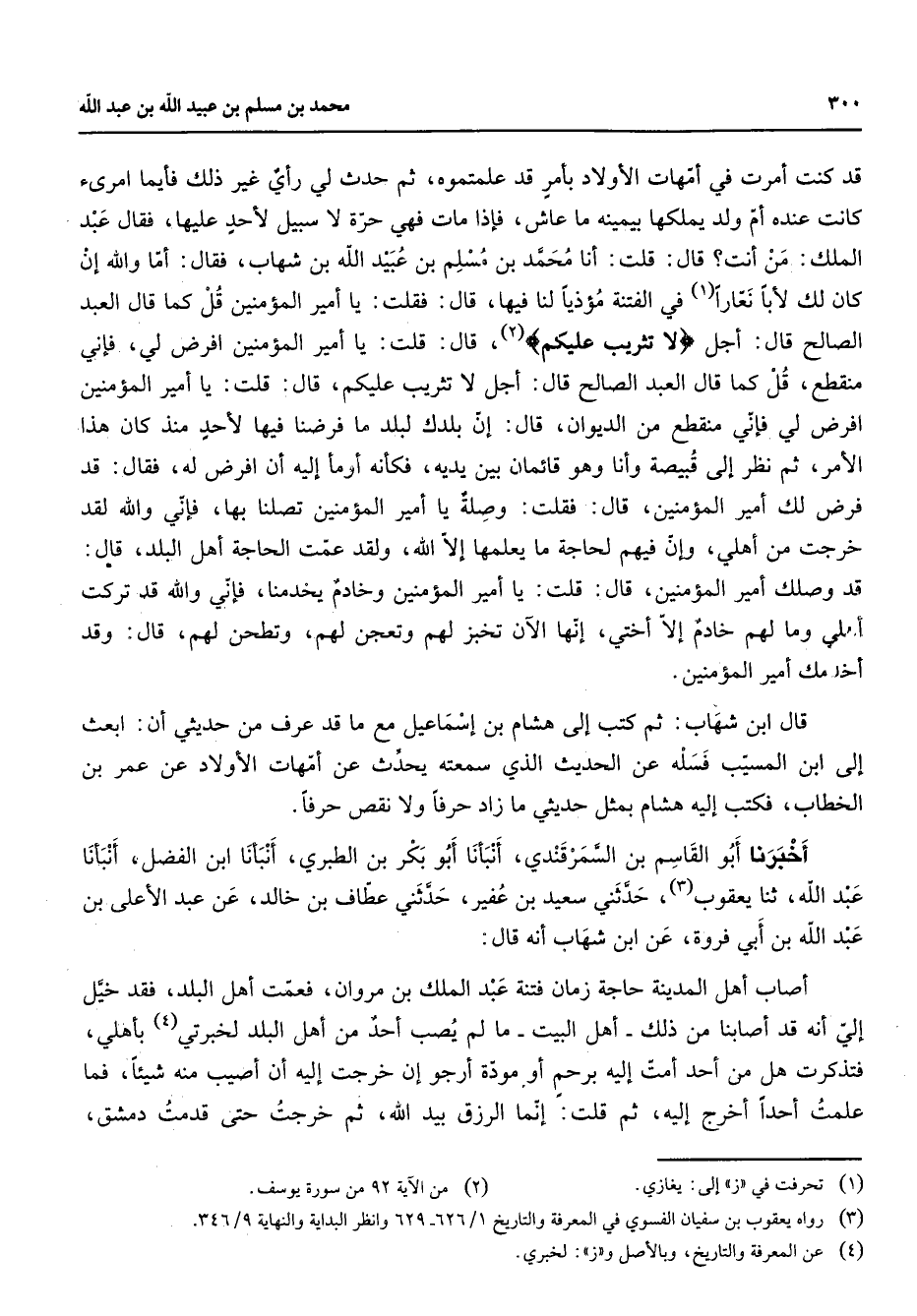 قد كنت أمرت في أمهات الأولاد بأمر قد علمتموه ثم حدث لي رأي غير ذلك فأيما امرئ كانت عنده أم ولد يملكها بيمينه ما عاش فإذا مات فهي حرة لا سبيل لأحد عليها فقال عبد الملك من أنت قال قلت أنا محمد بن مسلم بن عبيد الله بن شهاب فقال أما والله إن كان لك لأبا نعارا (1) في الفتنة مؤذيا لنا فيها قال فقلت يا أمير المؤمنين قل كما قال العبد الصالح قال: أجل " لا تثريب عليكم " (2) قال قلت يا أمير المؤمنين افرض لي فإني منقطع قل كما قال العبد الصالح قال أجل لا تثريب عليكم قال قلت يا أمير المؤمنين افرض لي فإني منقطع من الديوان قال إن بلدك لبلد ما فرضنا فيها لأحد منذ كان هذا الأمر ثم نظر إلى قبيصة وأنا وهو قائمان بين يديه فكأنه أومأ إليه أن افرض له فقال قد فرض لك أمير المؤمنين قال فقلت وصلة يا أمير المؤمنين تصلنا بها فإني والله لقد خرجت من أهلي وإن فيهم لحاجة ما يعلمها إلا الله ولقد عمت الحاجة أهل البلد قال قد وصلك أمير المؤمنين قال قلت يا أمير المؤمنين وخادم يخدمنا فإني والله قد تركت أهلي وما لهم خادم إلا أختي إنها الآن تخبز لهم وتعجن لهم وتطحن لهم قال وقد أخدمك أمير المؤمنين قال ابن شهاب ثم كتب إلى هشام بن إسماعيل مع ما قد عرف من حديثي أن ابعث إلى ابن المسيب فسله عن الحديث الذي سمعته يحدث عن أمهات الأولاد عن عمر بن الخطاب فكتب إليه هشام بمثل حديثي ما زاد حرفا ولا نقص حرفا أخبرنا أبو القاسم بن السمرقندي أنبأنا أبو بكر بن الطبري أنبأنا ابن الفضل أنبأنا عبد الله ثنا يعقوب (3) حدثني سعيد بن عفير حدثني عطاف بن خالد عن عبد الأعلى بن عبد الله بن أبي فروة عن ابن شهاب أنه قال أصاب أهل المدينة حاجة زمان فتنة عبد الملك بن مروان فعمت أهل البلد فقد خيل إلي أنه قد أصابنا من ذلك أهل البيت ما لم يصب أحد من أهل البلد لخبرتي (4) بأهلي فتذكرت هل من أحد أمت إليه برحم أو مودة أرجو إن خرجت إليه أن أصيب منه شيئا فما علمت أحدا أخرج إليه ثم قلت إنما الرزق بيد الله ثم خرجت حتى قدمت دمشق