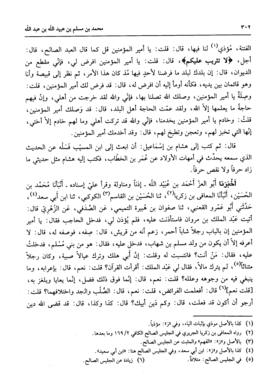 الفتنة مؤذي (1) لنا فيها قال قلت يا أمير المؤمنين قل كما قال العبد الصالح قال أجل " لا تثريب عليكم " قال قلت يا أمير المؤمنين افرض لي فإني مقطع من الديوان قال إن بلدك لبلدك ما فرضنا لأحد فيها مذ كان هذا الأمر ثم نظر إلى قبيصة وأنا وهو قائمان بين يديه فكأنه أومأ إليه أن افرض له قال قد فرض لك أمير المؤمنين قلت وصلة يا أمير المؤمنين وصلك الله تصلنا بها فإني والله لقد خرجت من أهلي وإن فيهم حاجة ما يعلمها إلا الله ولقد عمت الحاجة أهل البلد قال قد وصلك أمير المؤمنين قلت وخادم يا أمير المؤمنين يخدمنا فإني والله قد تركت أهلي وما لهم خادم إلا أختي إنها التي تخبز لهم وتعجن وتطبخ لهم قال وقد أخدمك أمير المؤمنين قال ثم كتب إلى هشام بن إسماعيل أن ابعث إلى ابن المسيب فسله عن الحديث الذي سمعه يحدث في أمهات الأولاد عن عمر بن الخطاب فكتب إليه هشام مثل حديثي ما زاد حرفا ولا نقص حرفا أخبرنا أبو العز أحمد بن عبيد الله إذنا ومناولة وقرأ علي إسناده أنبأنا محمد بن الحسين أنبأنا المعافى بن زكريا (2) ثنا الحسين بن القاسم (3) الكوكبي ثنا ابن أبي سعد (4) حدثني أبو عمرو القعنبي ثنا صفوان بن هبيرة التميمي عن الصدفي عن الزهري قال أتيت عبد الملك بن مروان فاستأذنت عليه فلم يؤذن لي فدخل الحاجب فقال يا أمير المؤمنين إن بالباب رجلا شابا أحمر زعم أنه من قريش قال صفه فوصفه له قال لا أعرفه إلا أن يكون من ولد مسلم بن شهاب فدخل عليه فقال هو من بني مسلم فدخلت عليه فقال من أنت فانتسبت له وقلت إن أبي هلك وترك عيالا صبية وكان رجلا مئناثا (5) لم يترك مالا فقال لي عبد الملك أقرأت القرآن قلت نعم قال بإعرابه وما ينبغي فيه من وجوهه وعلله قلت نعم قال إنما فوق ذلك فضل إنما يعايا ويلغز به [قلت نعم] (6) قال أفعلمت الفرائض قلت نعم قال الصلب والجد واختلافهما قلت أرجو أن أكون قد فعلت قال وكم دين أبيك قال كذا وكذا قال قد قضى الله دين