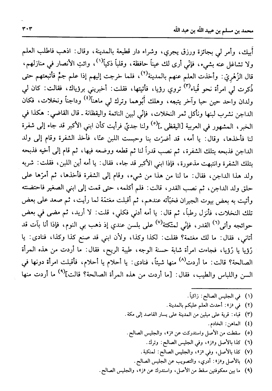 أبيك وأمر لي بجائزة ورزق يجري وشراء دار قطيعة بالمدينة وقال اذهب فاطلب العلم ولا تشاغل عنه بشئ فإني أرى لك عينا حافظة وقلبا ذكيا (1) وائت الأنصار في منازلهم قال الزهري وأخذت العلم عنهم بالمدينة (2) فلما خرجت إليهم إذا علم جم فاتبعتهم حتى ذكرت لي امرأة نحو قباء (3) تروي رؤيا فأتيتها فقلت أخبريني برؤياك فقالت كان لي ولدان واحد حين حبا وآخر يتبعه وهلك أبوهما وترك لي ماهنا (4) وداجنا ونخلات فكان الداجن نشرب لبنها ونأكل ثمر النخلات فإني لبينالنائمة واليقظانة قال القاضي هكذا في الخبر المشهور في العربية [اليقظى] (5) ولنا جدي فرأيت كأن ابني الأكبر قد جاء إلى شفرة لنا فأخذها وقال يا أمة قد أضرت بنا وحبست اللبن عنا فأخذ الشفرة وقام إلى ولد الداجن فذبحه بتلك الشفرة ثم نصب قدرا لنا ثم قطعه ووضعه فيها ثم قام إلى أخيه فذبحه بتلك الشفرة وانتبهت مذعورة فإذا ابني الأكبر قد جاء فقال يا أمة أين اللبن فقلت شربه ولد هذا الداجن فقال ما لنا من هذا من شئ وقام إلى الشفرة فأخذها ثم أمرها على حلق ولد الداجن ثم نصب القدر قالت فلم أكلمه حتى قمت إلى ابني الصغير فاحتضنته وأتيت به بعض بيوت الجيران فخبأته عندهم ثم أقبلت مغتمة لم رأيت ثم صعد على بعض تلك النخلات فأنزل رطبا ثم قال يا أمة ادني فكلي قلت لا أريد ثم مضى في بعض حوائجه وأتى (6) القدر فإني لمتكئة (7) على بلسن عندي إذ ذهب بي النوم فإذا أنا بآت قد أتاني فقال ما لك مغتمة فقلت لكذا وكذا ولأن ابني قد صنع كذا وكذا فنادى يا رؤيا يا رؤيا فجاءت امرأة شابة حسنة الوجه طيبة الريح فقال ما أردت من هذه المرأة الصالحة قالت ما أردت (8) منها شيئا فنادى يا أحلام يا أحلام فأقبلت امرأة دونها في السن واللباس والطيب فقال [ما أردت من هذه المرأة الصالحة قالت] (9) ما أردت منها
