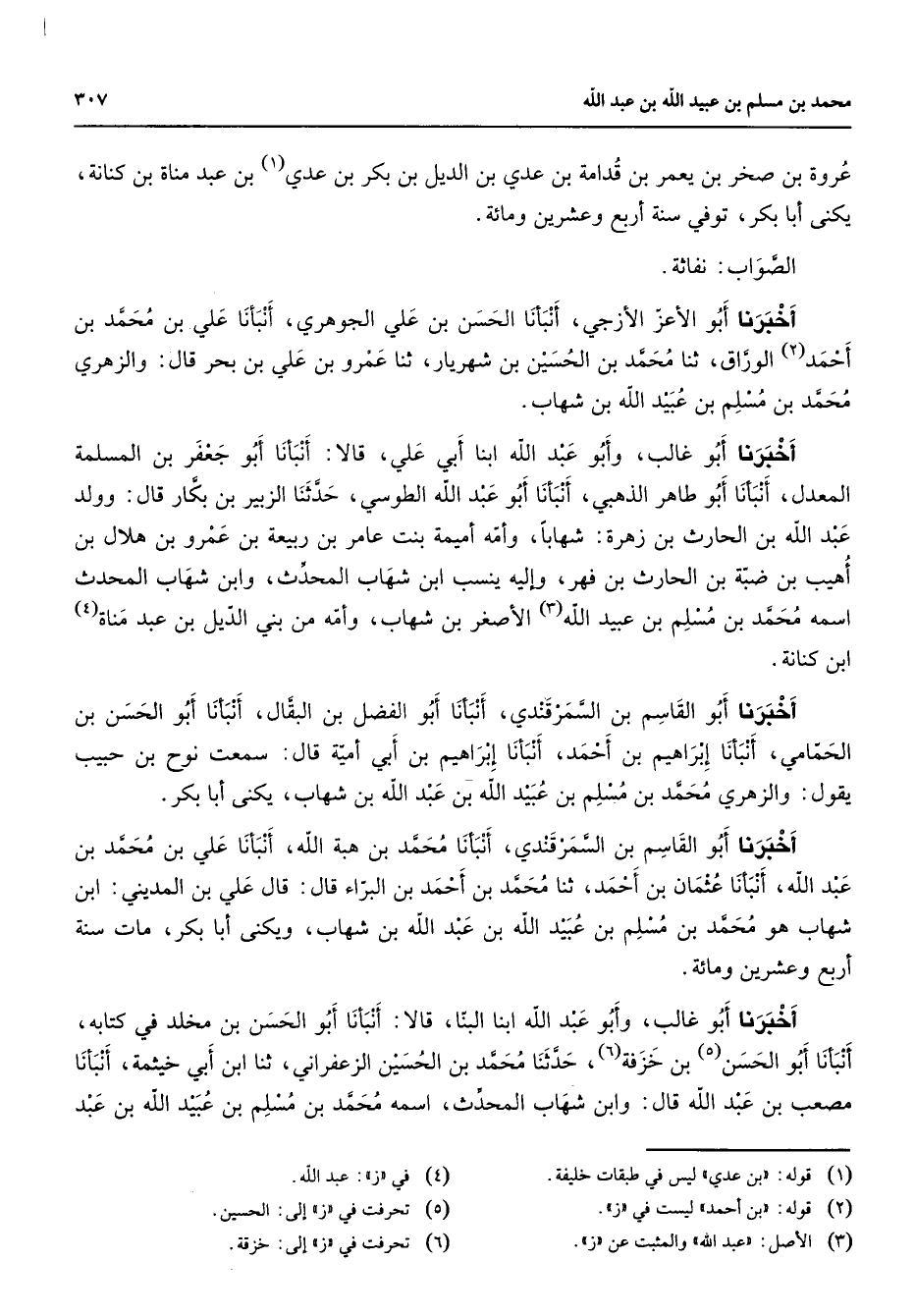 عروة بن صخر بن يعمر بن قدامة بن عدي بن الديل بن بكر بن عدي (1) بن عبد مناة بن كنانة يكنى أبا بكر توفي سنة أربع وعشرين ومائة الصواب نفاثة أخبرنا أبو الأعز الأزجي أنبأنا الحسن بن علي الجوهري أنبأنا علي بن محمد بن أحمد (2) الوراق ثنا محمد بن الحسين بن شهريار ثنا عمرو بن علي بن بحر قال والزهري محمد بن مسلم بن عبيد الله بن شهاب أخبرنا أبو غالب وأبو عبد الله ابنا أبي علي قالا أنبأنا أبو جعفر بن المسلمة المعدل أنبأنا أبو طاهر الذهبي أنبأنا أبو عبد الله الطوسي حدثنا الزبير بن بكار قال وولد عبد الله بن الحارث بن زهرة شهابا وأمه أميمة بنت عامر بن ربيعة بن عمرو بن هلال بن أهيب بن ضبة بن الحارث بن فهر وإليه ينسب ابن شهاب المحدث وابن شهاب المحدث اسمه محمد بن مسلم بن عبيد الله (3) الأصغر بن شهاب وأمه من بني الديل بن عبد مناة (4) ابن كنانة أخبرنا أبو القاسم بن السمرقندي أنبأنا أبو الفضل بن البقال أنبأنا أبو الحسن بن الحمامي أنبأنا إبراهيم بن أحمد أنبأنا إبراهيم بن أبي أمية قال سمعت نوح بن حبيب يقول: والزهري محمد بن مسلم بن عبيد الله بن عبد الله بن شهاب يكنى أبا بكر أخبرنا أبو القاسم بن السمرقندي أنبأنا محمد بن هبة الله أنبأنا علي بن محمد بن عبد الله أنبأنا عثمان بن أحمد ثنا محمد بن أحمد بن البراء قال قال علي ابن المديني ابن شهاب هو محمد بن مسلم بن عبيد الله بن عبد الله بن شهاب ويكنى أبا بكر مات سنة أربع وعشرين ومائة أخبرنا أبو غالب وأبو عبد الله ابنا البنا قالا أنبأنا أبو الحسن بن مخلد في كتابه أنبأنا أبو الحسن (5) بن خزفة (6) حدثنا محمد بن الحسين الزعفراني ثنا ابن أبي خيثمة أنبأنا مصعب بن عبد الله قال وابن شهاب المحدث اسمه محمد بن مسلم بن عبيد الله بن عبد