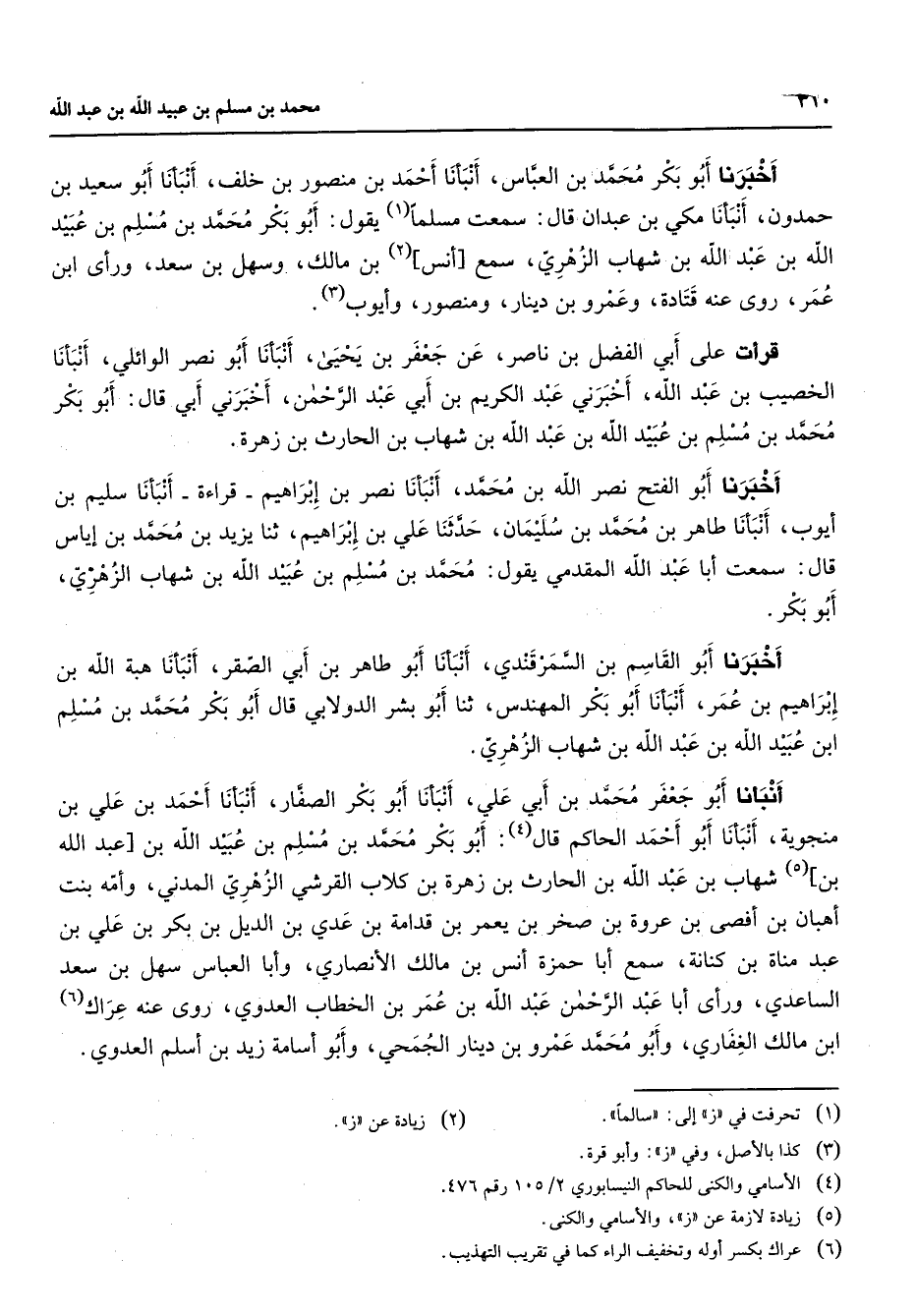 أخبرنا أبو بكر محمد بن العباس أنبأنا أحمد بن منصور بن خلف أنبأنا أبو سعيد بن حمدون أنبأنا مكي بن عبدان قال سمعت مسلما (1) يقول أبو بكر محمد بن مسلم بن عبيد الله بن عبد الله بن شهاب الزهري سمع [أنس] (2) بن مالك وسهل بن سعد ورأى ابن عمر روى عنه قتادة وعمرو بن دينار ومنصور وأيوب (3) قرأت على أبي الفضل بن ناصر عن جعفر بن يحيى أنبأنا أبو نصر الوائلي أنبأنا الخصيب بن عبد الله أخبرني عبد الكريم بن أبي عبد الرحمن أخبرني أبي قال أبو بكر محمد بن مسلم بن عبيد الله بن عبد الله بن شهاب بن الحارث بن زهرة أخبرنا أبو الفتح نصر الله بن محمد أنبأنا نصر بن إبراهيم قراءة أنبأنا سليم بن أيوب أنبأنا طاهر بن محمد بن سليمان حدثنا علي بن إبراهيم ثنا يزيد بن محمد بن إياس قال سمعت أبا عبد الله المقدمي يقول محمد بن مسلم بن عبيد الله بن شهاب الزهري أبو بكر أخبرنا أبو القاسم بن السمرقندي أنبأنا أبو طاهر بن أبي الصقر أنبأنا هبة الله بن إبراهيم بن عمر أنبأنا أبو بكر المهندس ثنا أبو بشر الدولابي قال أبو بكر محمد بن مسلم ابن عبيد الله بن عبد الله بن شهاب الزهري أنبأنا أبو جعفر محمد بن أبي علي أنبأنا أبو بكر الصفار أنبأنا أحمد بن علي بن منجوية أنبأنا أبو أحمد الحاكم قال (4) أبو بكر محمد بن مسلم بن عبيد الله بن [عبد الله بن] (5) شهاب بن عبد الله بن الحارث بن زهرة بن كلاب القرشي الزهري المدني وأمه بنت أهبان بن أفصى بن عروة بن صخر بن يعمر بن قدامة بن عدي بن الديل بن بكر بن علي بن عبد مناة بن كنانة سمع أبا حمزة أنس بن مالك الأنصاري وأبا العباس سهل بن سعد الساعدي ورأى أبا عبد الرحمن عبد الله بن عمر بن الخطاب العدوي روى عنه عراك (6) ابن مالك الغفاري وأبو محمد عمرو بن دينار الجمحي وأبو أسامة زيد بن أسلم العدوي