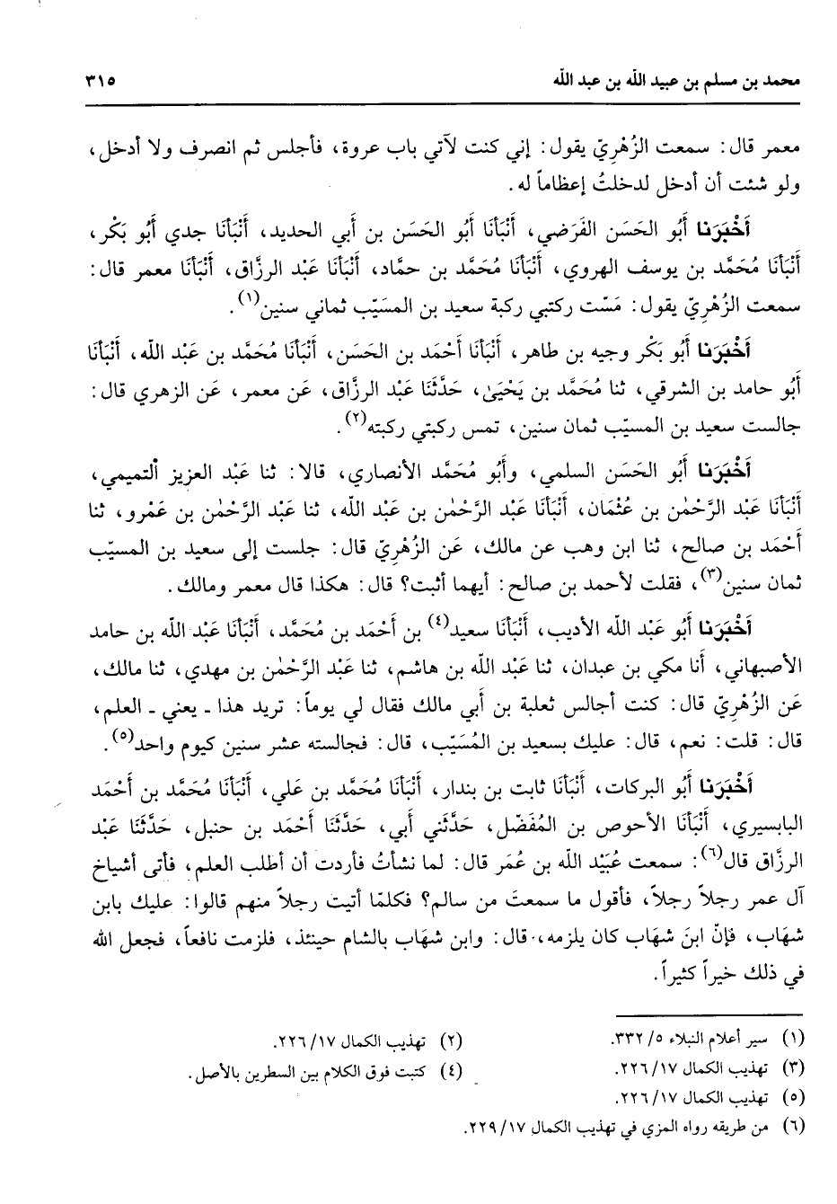 معمر قال سمعت الزهري يقول إني كنت لآتي باب عروة فأجلس ثم انصرف ولا أدخل ولو شئت أن أدخل لدخلت إعظاما له أخبرنا أبو الحسن الفرضي أنبأنا أبو الحسن بن أبي الحديد أنبأنا جدي أبو بكر أنبأنا محمد بن يوسف الهروي أنبأنا محمد بن حماد أنبأنا عبد الرزاق أنبأنا معمر قال سمعت الزهري يقول مست ركبتي ركبة سعيد بن المسيب ثماني سنين (1) أخبرنا أبو بكر وجيه بن طاهر أنبأنا أحمد بن الحسن أنبأنا محمد بن عبد الله أنبأنا أبو حامد بن الشرقي ثنا محمد بن يحيى حدثنا عبد الرزاق عن معمر عن الزهري قال جالست سعيد بن المسيب ثمان سنين تمس ركبتي ركبته (2) أخبرنا أبو الحسن السلمي وأبو محمد الأنصاري قالا ثنا عبد العزيز التميمي أنبأنا عبد الرحمن بن عثمان أنبأنا عبد الرحمن بن عبد الله ثنا عبد الرحمن بن عمرو ثنا أحمد بن صالح ثنا ابن وهب عن مالك عن الزهري قال جلست إلى سعيد بن المسيب ثمان سنين (3) فقلت لأحمد بن صالح أيهما أثبت قال هكذا قال معمر ومالك أخبرنا أبو عبد الله الأديب أنبأنا سعيد (4) بن أحمد بن محمد أنبأنا عبد الله بن حامد الأصبهاني أنا مكي بن عبدان ثنا عبد الله بن هاشم ثنا عبد الرحمن بن مهدي ثنا مالك عن الزهري قال كنت أجالس ثعلبة بن أبي مالك فقال لي يوما تريد هذا يعني العلم قال قلت نعم قال عليك بسعيد بن المسيب قال فجالسته عشر سنين كيوم واحد (5) أخبرنا أبو البركات أنبأنا ثابت بن بندار أنبأنا محمد بن علي أنبأنا محمد بن أحمد البابسيري أنبأنا الأحوص بن المفضل حدثني أبي حدثنا أحمد بن حنبل حدثنا عبد الرزاق قال (6) سمعت عبيد الله بن عمر قال لما نشأت فأردت أن أطلب العلم فأتى أشياخ آل عمر رجلا رجلا فأقول ما سمعت من سالم فكلما أتيت رجلا منهم قالوا عليك بابن شهاب فإن ابن شهاب كان يلزمه قال وابن شهاب بالشام حينئذ فلزمت نافعا فجعل الله في ذلك خيرا كثيرا