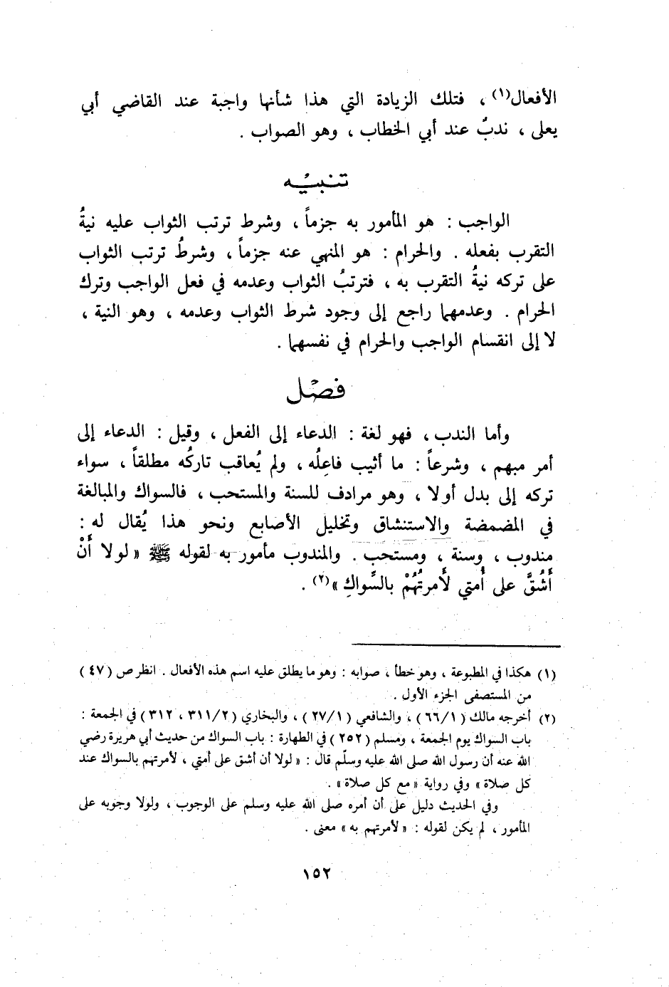 وَأما النّدب فَهُوَ لُغَة الدُّعَاء إِلَى الْفِعْل وَقيل إِلَى أَمر مُبْهَم وَشرعا مَا أثيب فَاعله وَلم يُعَاقب تَاركه مُطلقًا سَوَاء تَركه إِلَى بدل أَو لَا وَهُوَ مرادف للسّنة وَالْمُسْتَحب فالسواك وَالْمُبَالغَة فِي الْمَضْمَضَة وَالِاسْتِنْشَاق وتخليل الْأَصَابِع وَنَحْو هَذَا مَا يُقَال لَهُ مَنْدُوب وَسنة ومستحب وَالْمَنْدُوب مَأْمُور بِهِ لقَوْله صلى الله عَلَيْهِ وَسلم لَوْلَا أَن أشق على أمتِي لأمرتهم بِالسِّوَاكِ