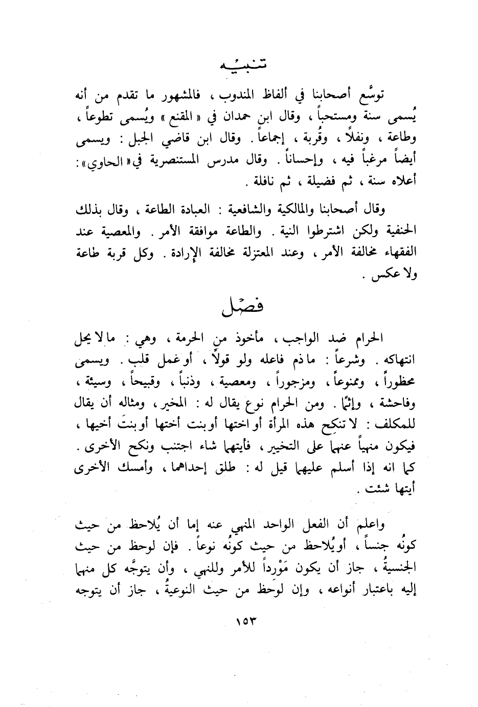 وَمن الْحَرَام نوع يُقَال لَهُ الْمُخَير ومثاله أَن يُقَال للمكلف لَا تنْكح هَذِه الْمَرْأَة أَو أُخْتهَا أَو بنت أُخْتهَا أَو بنت أَخِيهَا فَيكون مَنْهِيّا عَنْهُمَا على التَّخْيِير فأيتهما شَاءَ اجْتنب ونكح الْأُخْرَى كَمَا أَنه إِذا أسلم عَلَيْهِمَا قيل لَهُ طلق إِحْدَاهمَا وَأمْسك الْأُخْرَى أيتها شِئْت وَاعْلَم أَن الْفِعْل الْوَاحِد الْمنْهِي عَنهُ إِمَّا أَن يُلَاحظ من حَيْثُ كَونه جِنْسا أَو يُلَاحظ من حَيْثُ كَونه نوعا فَإِن لوحظ من حَيْثُ الجنسية جَازَ أَن يكون موردا لِلْأَمْرِ وللنهي وَأَن يتَوَجَّه كل مِنْهُمَا إِلَيْهِ بِاعْتِبَار أَنْوَاعه وَإِن لوحظ من حَيْثُ النوعية جَازَ أَن يتَوَجَّه
