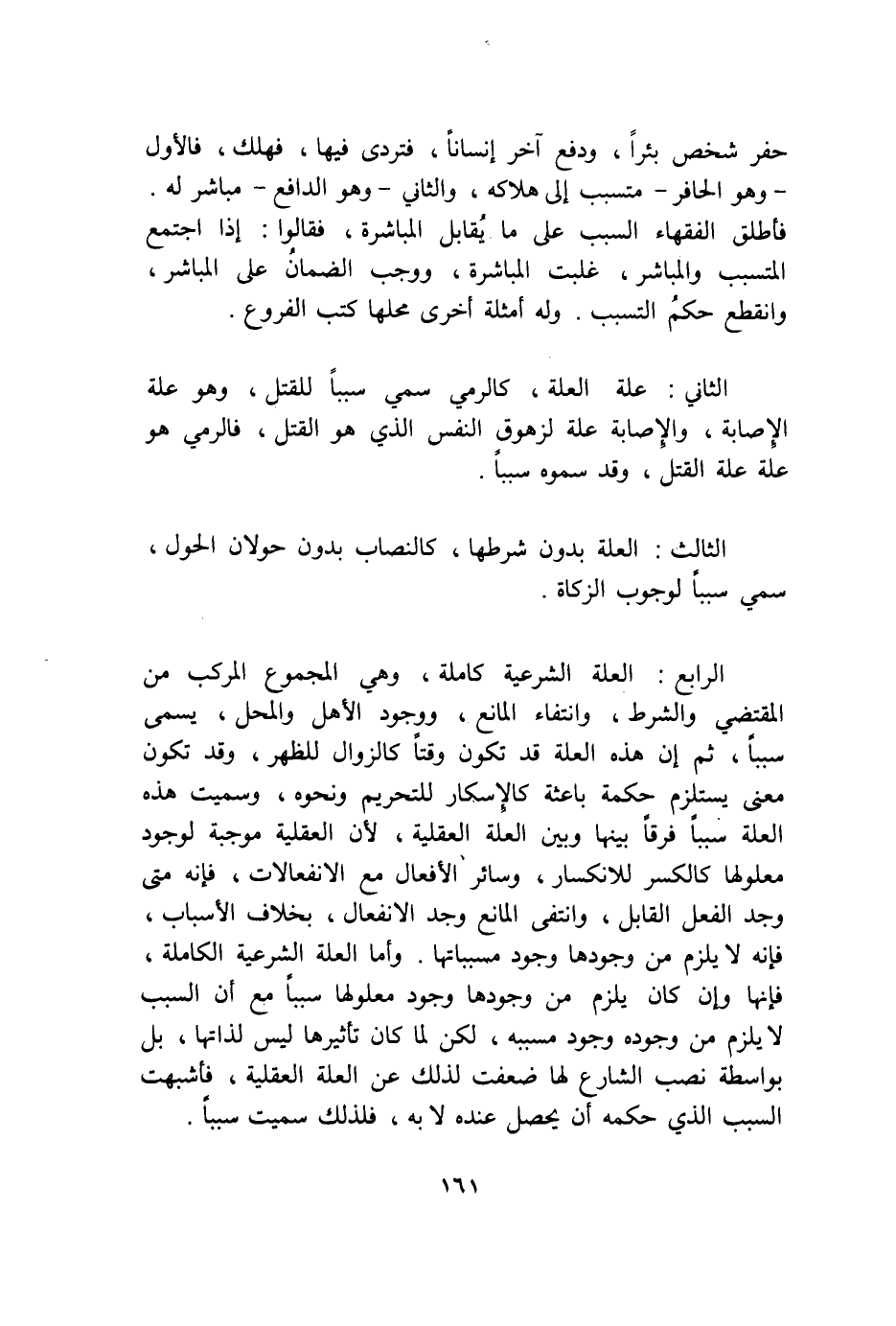 الرَّابِع الْعلَّة الشَّرْعِيَّة كَامِلَة وَهِي الْمَجْمُوع الْمركب من الْمُقْتَضى وَالشّرط وَانْتِفَاء الْمَانِع وَوُجُود الْأَهْل وَالْمحل يُسمى سَببا ثمَّ إِن هَذِه الْعلَّة قد تكون وقتا كالزوال لِلظهْرِ وَقد تكون معنى يسْتَلْزم حِكْمَة باعثة كالإسكار للتَّحْرِيم وَنَحْوه وَسميت هَذِه الْعلَّة سَببا فرقا بَينهَا وَبَين الْعلَّة الْعَقْلِيَّة لِأَن الْعَقْلِيَّة مُوجبَة لوُجُود معلولها كالكسر للانكسار وَسَائِر الْأَفْعَال مَعَ الانفعالات فَإِنَّهُ مَتى وجد الْفِعْل الْقَابِل وانتفى الْمَانِع وجد الانفعال بِخِلَاف الْأَسْبَاب فَإِنَّهُ لَا يلْزم من وجودهَا وجود مسبباتها وَأما الْعلَّة الشَّرْعِيَّة الْكَامِلَة فَإِنَّهَا وَإِن كَانَ يلْزم من وجودهَا وجود معلولها سَببا مَعَ أَن السَّبَب لَا يلْزم من وجوده وجود مسببه لَكِن لما كَانَ تأثيرها لَيْسَ لذاتها بل بِوَاسِطَة نصب الشَّارِع لَهَا ضعفت لذَلِك عَن الْعلَّة الْعَقْلِيَّة فَأَشْبَهت السَّبَب الَّذِي حكمه أَن يحصل عِنْده لَا بِهِ فَلذَلِك سميت سَببا