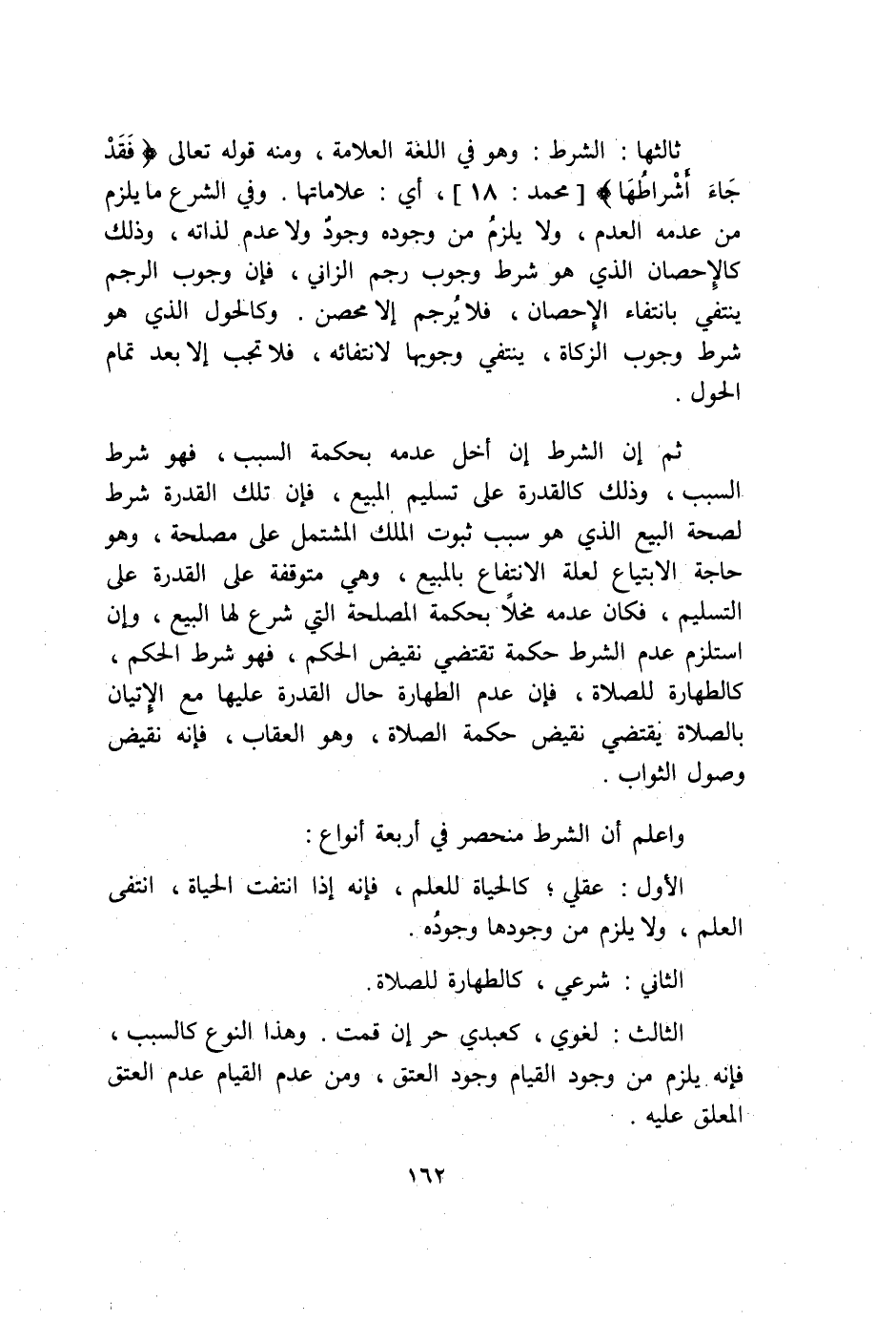 ثَالِثهَا الشَّرْط وَهُوَ فِي اللُّغَة الْعَلامَة وَمِنْه قَوْله تَعَالَى {فَقَدْ جَاءَ أَشْرَاطُهَا} مُحَمَّد 18 أَي علاماتها وَفِي الشَّرْع مَا يلْزم من عَدمه الْعَدَم وَلَا يلْزم من وجوده وجود وَلَا عدم لذاته وَذَلِكَ كالإحصان الَّذِي هُوَ شَرط وجوب رجم الزَّانِي فَإِن وجوب الرَّجْم يَنْتَفِي بِانْتِفَاء الْإِحْصَان فَلَا يرْجم إِلَّا مُحصن وكالحول الَّذِي هُوَ شَرط وجوب الزَّكَاة يَنْتَفِي وُجُوبهَا لانتفائه فَلَا تجب إِلَّا بعد تَمام الْحول