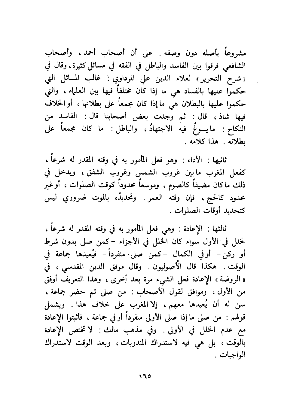 ثَالِثهَا الْإِعَادَة وَهِي فعل الْمَأْمُور بِهِ فِي وقته الْمُقدر لَهُ شرعا لخلل فِي الأول سَوَاء كَانَ الْخلَل فِي الْأَجْزَاء كمن صلى بِدُونِ شَرط أَو ركن أَو فِي الْكَمَال كمن صلى مُنْفَردا فيعيدها جمَاعَة فِي الْوَقْت هَكَذَا قَالَ الأصوليون وَقَالَ موفق الدّين الْمَقْدِسِي فِي الرَّوْضَة الْإِعَادَة فعل الشَّيْء مرّة بعد أُخْرَى وَهَذَا التَّعْرِيف أوفق من الأول وموافق لقَوْل الْأَصْحَاب من صلى ثمَّ حضر جمَاعَة سنّ لَهُ أَن يُعِيدهَا مَعَهم إِلَّا الْمغرب على خلاف هَذَا ويشمل قَوْلهم من صلى مَا إِذا صلى الأولى مُنْفَردا أَو فِي جمَاعَة فأثبتوا الْإِعَادَة مَعَ عدم الْخلَل فِي الأولى وَفِي مَذْهَب مَالك لَا تخْتَص الْإِعَادَة بِالْوَقْتِ بل هِيَ فِيهِ لاستدراك المندوبات وَبعد الْوَقْت لاستدراك الْوَاجِبَات