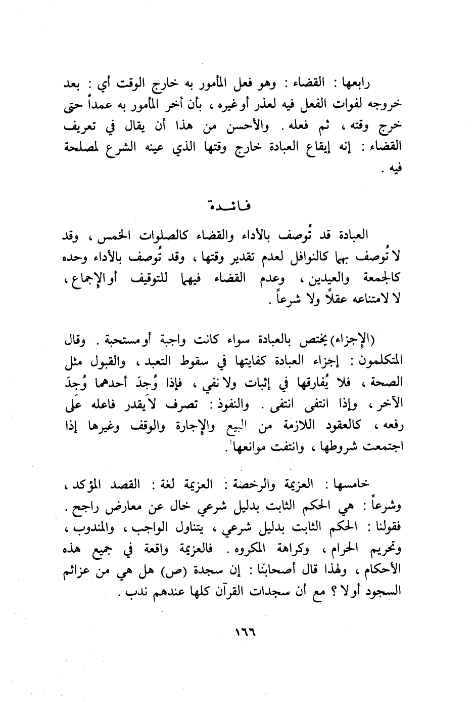 رَابِعهَا الْقَضَاء وَهُوَ فعل الْمَأْمُور بِهِ خَارج الْوَقْت أَي بعد خُرُوجه لفَوَات الْفِعْل فِيهِ لعذر أَو غَيره بِأَن أخر الْمَأْمُور بِهِ عمدا حَتَّى خرج وقته ثمَّ فعله وَالْأَحْسَن من هَذَا أَن يُقَال فِي تَعْرِيف الْقَضَاء أَنه إِيقَاع الْعِبَادَة خَارج وَقتهَا الَّذِي عينه الشَّرْع لمصْلحَة فِيهِ