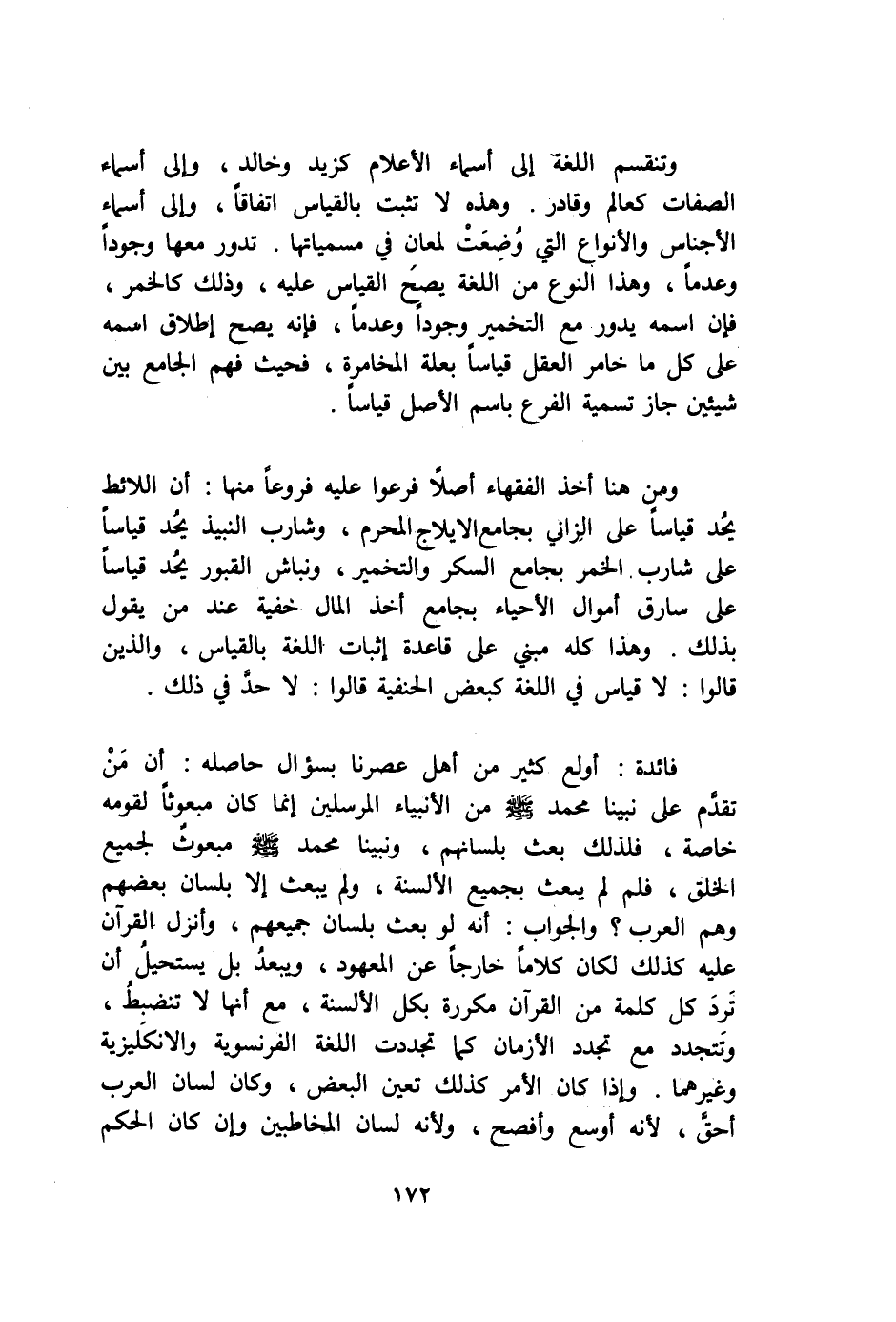 وتنقسم اللُّغَة إِلَى أَسمَاء الْأَعْلَام كزيد وخَالِد وَإِلَى أَسمَاء الصِّفَات كعالم وقادر وَهَذِه لاتثبت بِالْقِيَاسِ اتِّفَاقًا وَإِلَى أَسمَاء الْأَجْنَاس والأنواع الَّتِي وضعت لمعان فِي مسمياتها تَدور مَعهَا وجودا وعدما وَهَذَا النَّوْع من اللُّغَة يَصح الْقيَاس عَلَيْهِ وَذَلِكَ كَالْخمرِ فَإِن اسْمه يَدُور مَعَ التخمير وجودا وعدما فَإِنَّهُ يَصح إِطْلَاق اسْمه على كل مَا خامر الْعقل قِيَاسا بعلة المخامرة فَحَيْثُ فهم الْجَامِع بَين شَيْئَيْنِ جَازَ تَسْمِيَة الْفَرْع باسم الأَصْل قِيَاسا وَمن هُنَا أَخذ الْفُقَهَاء أصلا فرعوا عَلَيْهِ فروعا مِنْهَا أَن اللائط يحد قِيَاسا على الزَّانِي بِجَامِع الْإِيلَاج الْمحرم وشارب النَّبِيذ يحد قِيَاسا على شَارِب الْخمر بِجَامِع السكر والتخمير ونباش الْقُبُور يحد قِيَاسا على سَارِق أَمْوَال الْأَحْيَاء بِجَامِع أَخذ المَال خُفْيَة عِنْد من يَقُول بذلك وَهَذَا كُله مَبْنِيّ على قَاعِدَة إِثْبَات اللُّغَة بِالْقِيَاسِ وَالَّذين قَالُوا لَا قِيَاس فِي اللُّغَة كبعض الْحَنَفِيَّة قَالُوا لَا حد فِي ذَلِك