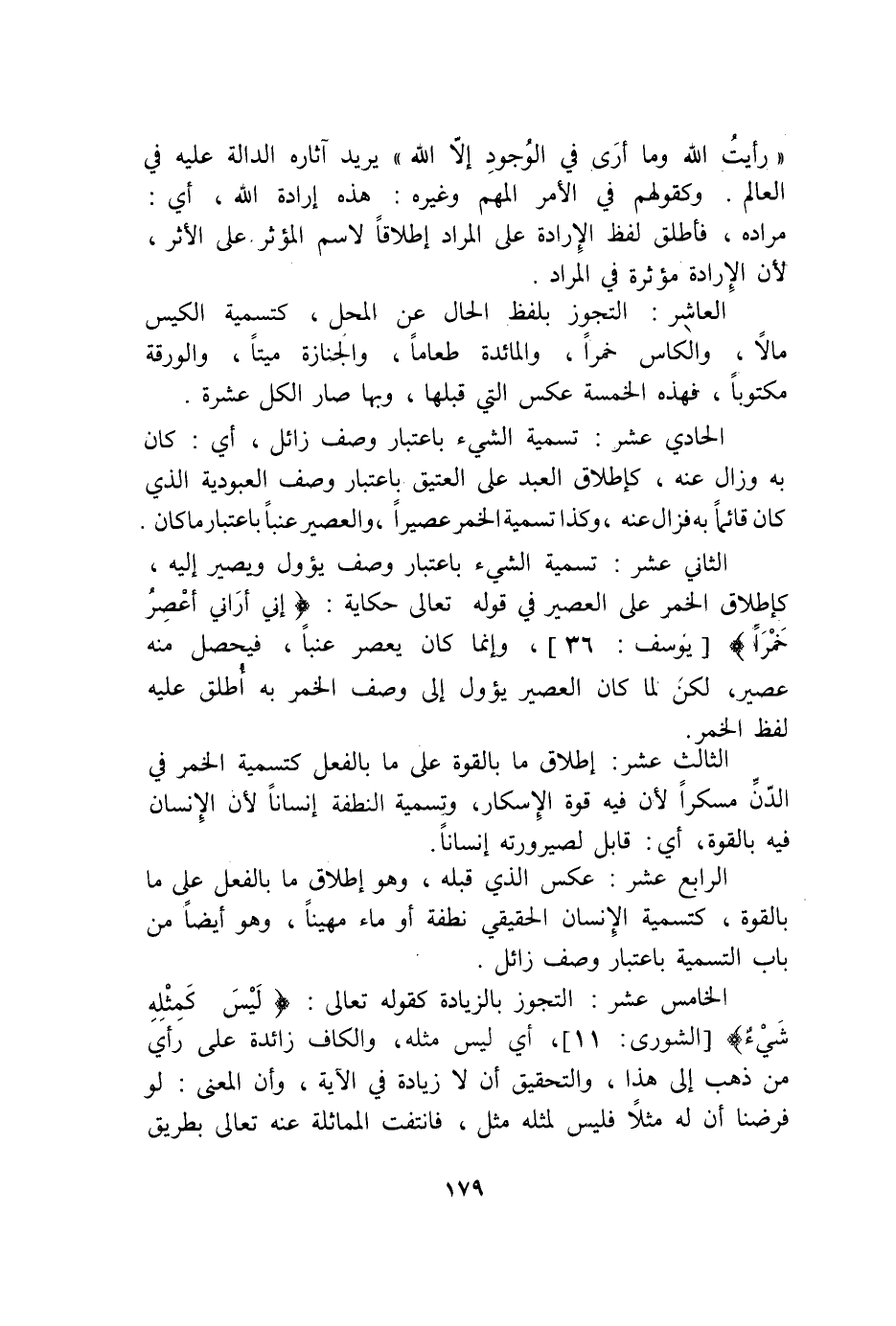 الثَّانِي عشر تَسْمِيَة الشَّيْء بِاعْتِبَار وصف يؤول وَيصير إِلَيْهِ كإطلاق الْخمر على الْعصير فِي قَوْله تَعَالَى حِكَايَة {إِنِّي أَرَانِي أَعْصِرُ خَمْراً} يُوسُف 36 وَإِنَّمَا كَانَ يعصر عنبا فَيحصل مِنْهُ عصير