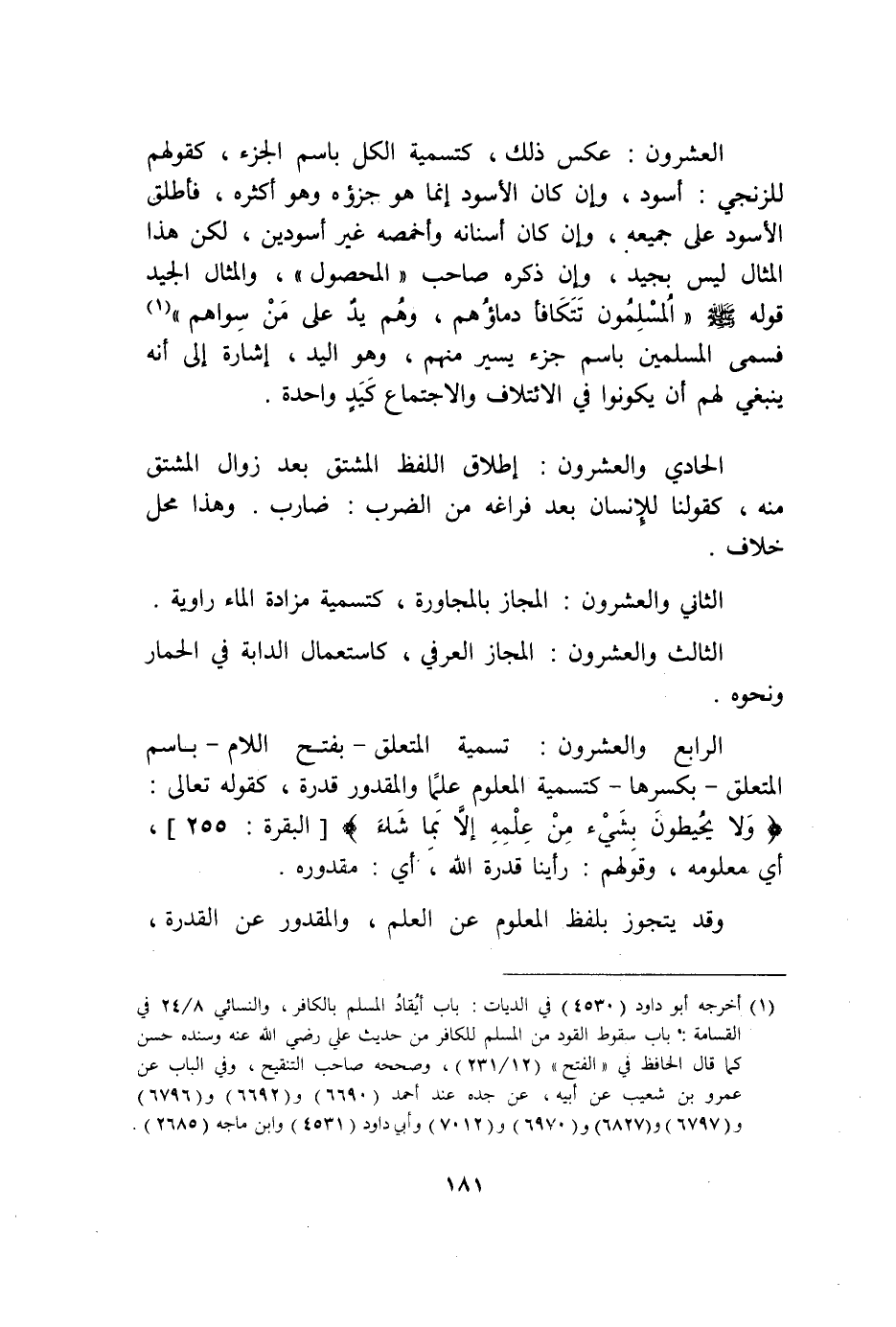 الْعشْرُونَ عكس ذَلِك كتسمية الْكل باسم الْجُزْء كَقَوْلِهِم للزنجي أسود وَإِن كَانَ الْأسود إِنَّمَا هُوَ جزئه وَهُوَ أَكْثَره فَأطلق الْأسود على جَمِيعه وَإِن كَانَ أَسْنَانه وأخمصه أسودين لَكِن هَذَا الْمِثَال لَيْسَ بجيد وَإِن ذكره صَاحب الْمَحْصُول والمثال الْجيد قَوْله صلى الله عَلَيْهِ وَسلم الْمُسلمُونَ تَتَكَافَأ دِمَاؤُهُمْ وهم يَد على من سواهُم فَسمى الْمُسلمين باسم جُزْء يسير مِنْهُم وَهُوَ الْيَد إِشَارَة إِلَى أَنه يَنْبَغِي لَهُم أَن يَكُونُوا فِي الائتلاف والاجتماع كيد وَاحِدَة