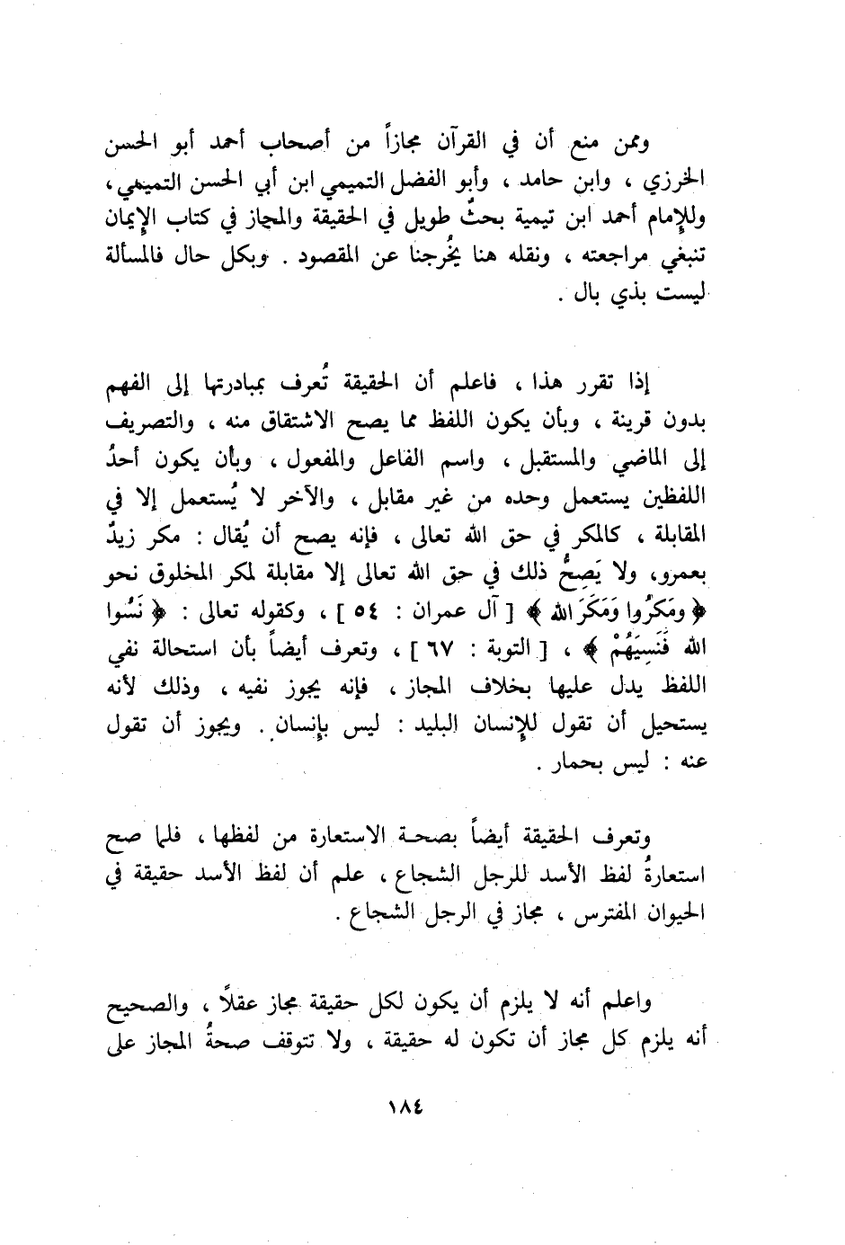 وَمِمَّنْ منع أَن فِي الْقُرْآن مجَازًا من أَصْحَاب أَحْمد أَبُو الْحسن الخرزي وَابْن حَامِد وَأَبُو الْفضل التَّمِيمِي ابْن أبي الْحسن التَّمِيمِي وَللْإِمَام أَحْمد ابْن تَيْمِية بحث طَوِيل فِي الْحَقِيقَة وَالْمجَاز فِي كتاب الْإِيمَان تنبغي مُرَاجعَته وَنَقله هُنَا يخرجنا عَن الْمَقْصُود وَبِكُل حَال فَالْمَسْأَلَة لَيست بِذِي بَال إِذا تقرر هَذَا فَاعْلَم أَن الْحَقِيقَة تعرف بمبادرتها إِلَى الْفَهم بِدُونِ قرينَة وَبِأَن يكون اللَّفْظ مِمَّا يَصح الِاشْتِقَاق مِنْهُ والتصريف إِلَى الْمَاضِي والمستقبل وَاسم الْفَاعِل وَالْمَفْعُول وَبِأَن يكون أحد اللَّفْظَيْنِ يسْتَعْمل وَحده من غير مُقَابل وَالْآخر لَا يسْتَعْمل إِلَّا فِي الْمُقَابلَة كالمكر فِي حق الله تَعَالَى فَإِنَّهُ يَصح أَن يُقَال مكر زيد بعمر وَلَا يَصح ذَلِك فِي حق الله تَعَالَى إِلَّا مُقَابلَة لمكر الْمَخْلُوق نَحْو ومكروا ومكر الله وَكَقَوْلِه تَعَالَى {كَالَّذِين نسوا الله} وتعرف أَيْضا بِأَن اسْتِحَالَة نفي اللَّفْظ يدل عَلَيْهَا بِخِلَاف الْمجَاز فَإِنَّهُ يجوز نَفْيه وَذَلِكَ لِأَنَّهُ يَسْتَحِيل أَن تَقول للْإنْسَان البليد لَيْسَ بِإِنْسَان وَيجوز أَن تَقول عَنهُ لَيْسَ بِحِمَار وتعرف الْحَقِيقَة أَيْضا بِصِحَّة الِاسْتِعَارَة من لَفظهَا فَلَمَّا صَحَّ اسْتِعَارَة لفظ الْأسد للرجل الشجاع علم أَن لفظ الْأسد حَقِيقَة فِي الْحَيَوَان المفترس مجَاز فِي الرجل الشجاع