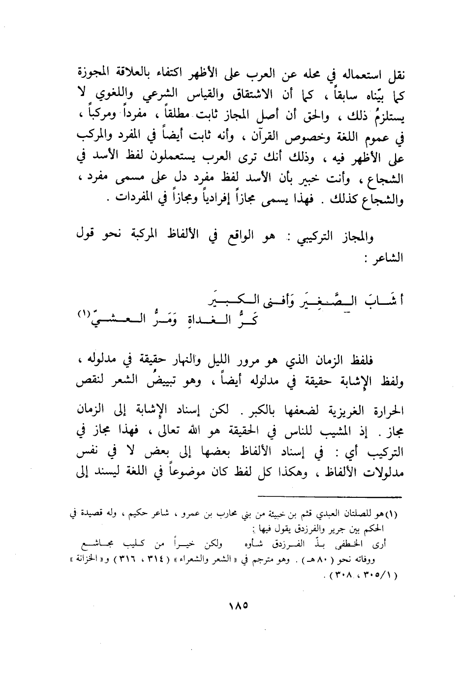 نقل اسْتِعْمَاله فِي مَحَله عَن الْعَرَب على الْأَظْهر اكْتِفَاء بالعلاقة المجوزة كَمَا بَيناهُ سَابِقًا كَمَا أَن الِاشْتِقَاق وَالْقِيَاس الشَّرْعِيّ واللغوي لَا يسْتَلْزم ذَلِك وَالْحق أَن أصل الْمجَاز ثَابت مُطلقًا مُفردا ومركبا فِي عُمُوم اللُّغَة وخصوص الْقُرْآن وَأَنه ثَابت أَيْضا فِي الْمُفْرد والمركب على الْأَظْهر فِيهِ وَذَلِكَ أَنَّك ترى الْعَرَب يستعملون لفظ الْأسد فِي الشجاع وَأَنت خَبِير بِأَن الْأسد لفظ مُفْرد دلّ على مُسَمّى مُفْرد والشجاع كَذَلِك فَهَذَا يُسمى مجَازًا إفراديا ومجازا فِي الْمُفْردَات وَالْمجَاز التركيبي هُوَ الْوَاقِع فِي الْأَلْفَاظ المركبة نَحْو قَول الشَّاعِر أشاب الصَّغِير وأفنى الْكَبِير كرّ الْغَدَاة وَمر الْعشي فَلفظ الزَّمَان الَّذِي هُوَ مُرُور اللَّيْل وَالنَّهَار حَقِيقَة فِي مَدْلُوله وَلَفظ الإشابة حَقِيقَة فِي مَدْلُوله أَيْضا وَهُوَ تبييض الشّعْر لنَقص الْحَرَارَة الغريزية لِضعْفِهَا بِالْكبرِ لَكِن إِسْنَاد الإشابة إِلَى الزَّمَان مجَاز إِذْ المشيب للنَّاس فِي الْحَقِيقَة هُوَ الله تَعَالَى فَهَذَا مجَاز فِي التَّرْكِيب أَي فِي إِسْنَاد الْأَلْفَاظ بَعْضهَا إِلَى بعض لَا فِي نفس مدلولات الْأَلْفَاظ وَهَكَذَا كل لفظ كَانَ مَوْضُوعا فِي اللُّغَة ليسند إِلَى