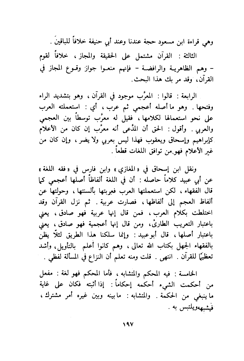 كَمَا قَالَ الْفُقَهَاء لَكِن استعملتها الْعَرَب فعربتها بألسنتها وحولتها عَن أَلْفَاظ الْعَجم إِلَى ألفاظها فَصَارَت عَرَبِيَّة ثمَّ نزل الْقُرْآن وَقد اخْتلطت بِكَلَام الْعَرَب فَمن قَالَ إِنَّهَا عَرَبِيَّة ثمَّ فَهُوَ صَادِق يَعْنِي بِاعْتِبَار التعريب الطارىء وَمن قَالَ إِنَّهَا أَعْجَمِيَّة فَهُوَ صَادِق يَعْنِي بِاعْتِبَار أَصْلهَا قَالَ أَبُو عبيد وَإِنَّمَا سلكنا هَذَا الطَّرِيق لِئَلَّا يظنّ بالفقهاء الْجَهْل بِكِتَاب الله تَعَالَى وهم كَانُوا أعلم بالتأويل وَأَشد تَعْظِيمًا لِلْقُرْآنِ انْتهى