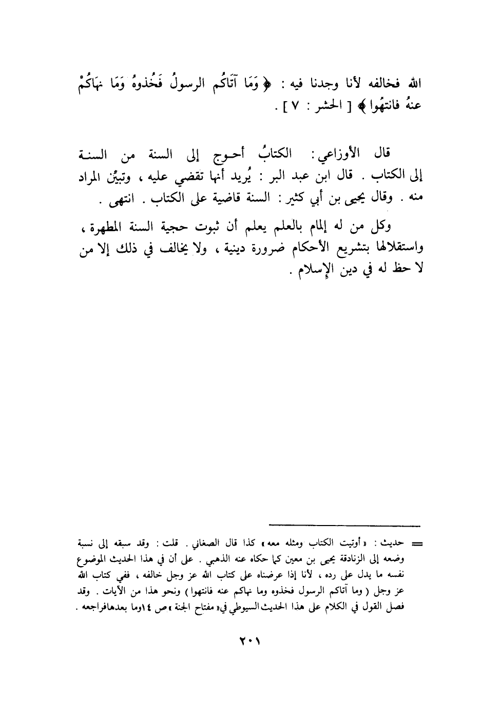 وكل من لَهُ إِلْمَام بِالْعلمِ يعلم أَن ثُبُوت حجية السّنة المطهرة واستقلالها بتشريع الْأَحْكَام ضَرُورِيَّة دينية وَلَا يُخَالف فِي ذَلِك إِلَّا من لَا حَظّ لَهُ فِي دين الْإِسْلَام
