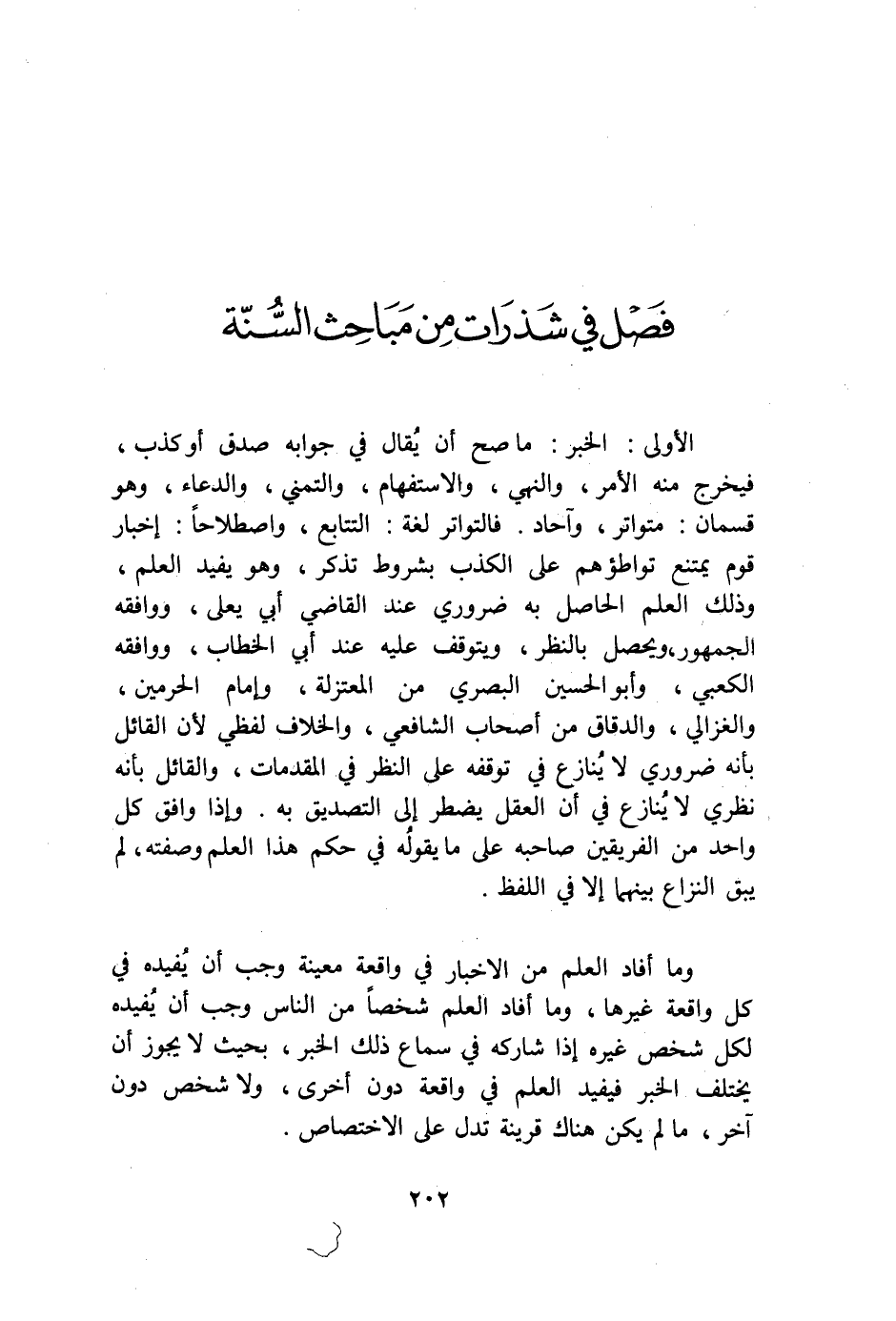 وَالْقَائِل بِأَنَّهُ نَظَرِي لَا يُنَازع فِي أَن الْعقل يضْطَر إِلَى التَّصْدِيق بِهِ وَإِذا وَافق كل وَاحِد من الْفَرِيقَيْنِ صَاحبه على مَا يَقُوله فِي حكم هَذَا الْعلم وَصفته لم يبْق النزاع بَينهمَا إِلَّا فِي اللَّفْظ وَمَا أَفَادَ الْعلم من الْأَخْبَار فِي وَاقعَة مُعينَة وَجب أَن يفِيدهُ فِي كل وَاقعَة غَيرهَا وَمَا أَفَادَ الْعَالم شخصا من النَّاس وَجب أَن يفِيدهُ لكل شخص غَيره إِذا شَاركهُ فِي سَماع ذَلِك الْخَبَر بِحَيْثُ لَا يجوز أَن يخْتَلف الْخَبَر فَيُفِيد الْعلم فِي وَاقعَة دون أُخْرَى وَلَا شخص دون آخر مَا لم يكن هُنَاكَ قرينَة تدل على الِاخْتِصَاص