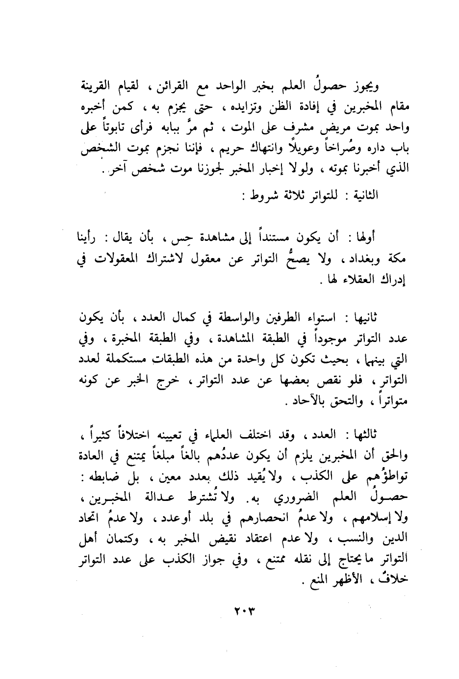 الثَّانِيَة للتواتر ثَلَاثَة شُرُوط أَولهَا أَن يكون مُسْتَندا إِلَى مُشَاهدَة حس بِأَن يُقَال رَأينَا مَكَّة وبغداد وَلَا يَصح التَّوَاتُر عَن مَعْقُول لاشتراك المعقولات فِي إِدْرَاك الْعُقَلَاء لَهَا