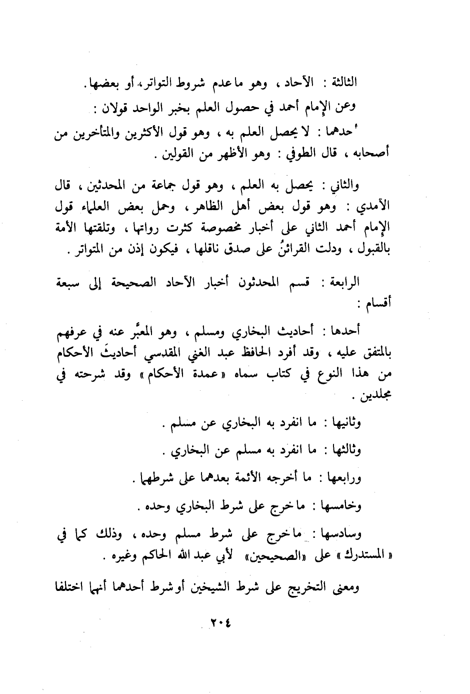 الرَّابِعَة قسم المحدثون أَخْبَار الْآحَاد الصَّحِيحَة إِلَى سَبْعَة أَقسَام أَحدهَا أَحَادِيث البُخَارِيّ وَمُسلم وَهُوَ الْمعبر عَنهُ فِي عرفهم بالمتفق عَلَيْهِ وَقد أفرد الْحَافِظ عبد الْغَنِيّ الْمَقْدِسِي أَحَادِيث الْأَحْكَام من هَذَا النَّوْع فِي كتاب سَمَّاهُ عُمْدَة الْأَحْكَام وَقد شرحته فِي مجلدين